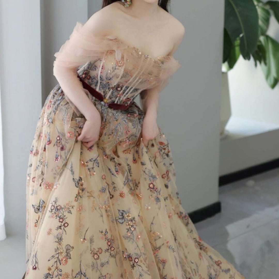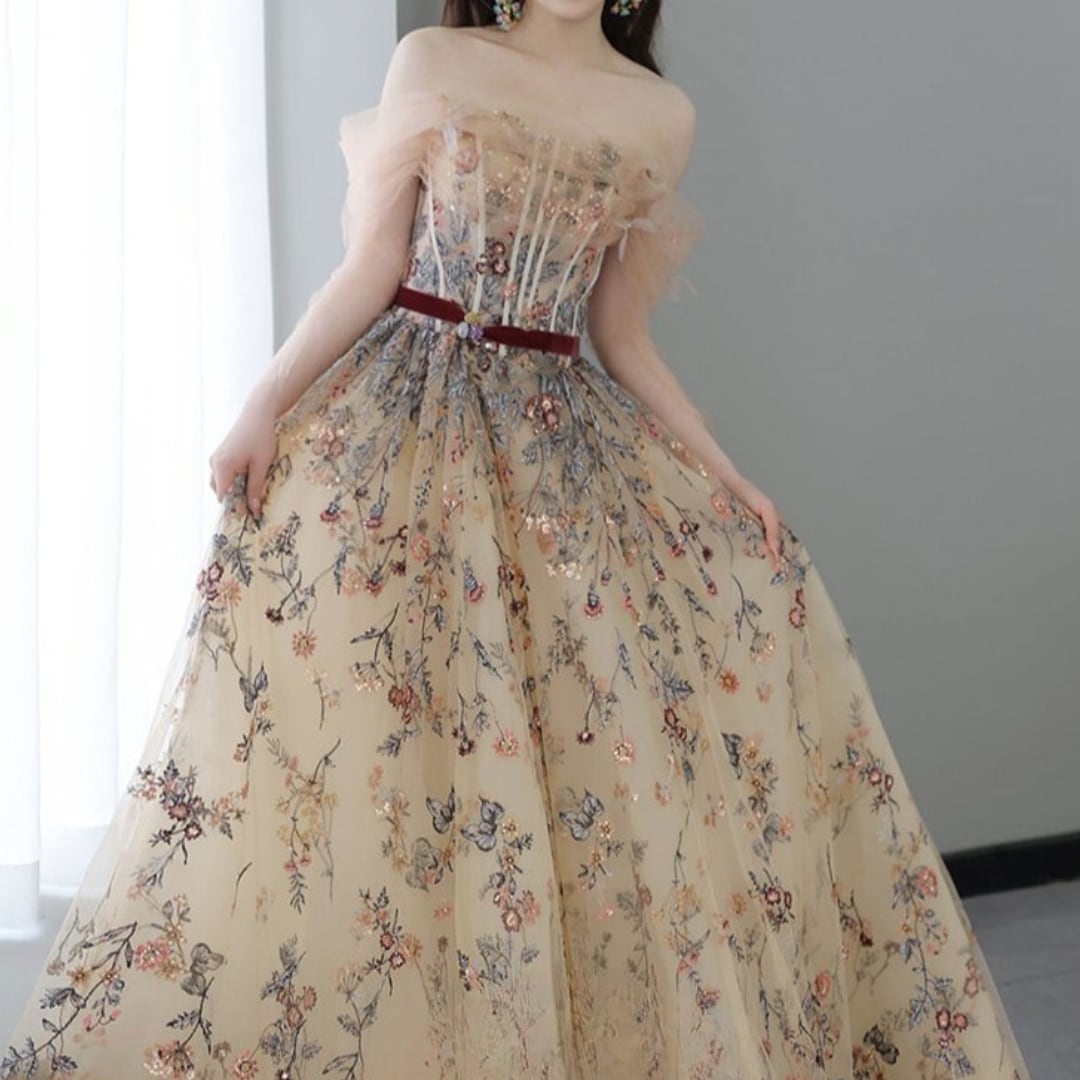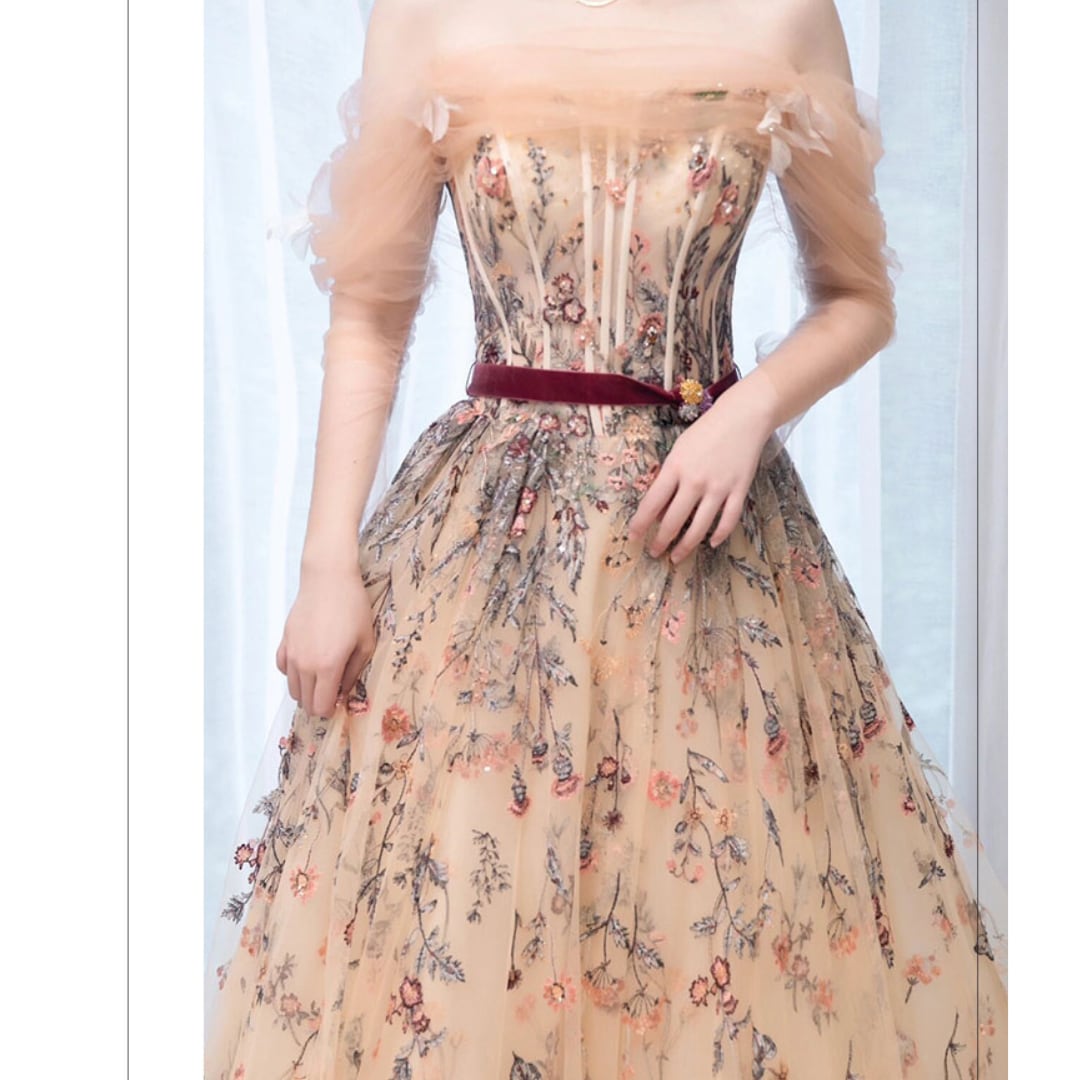 繊細な花柄の刺繍を施した上品で可愛らしいドレス。