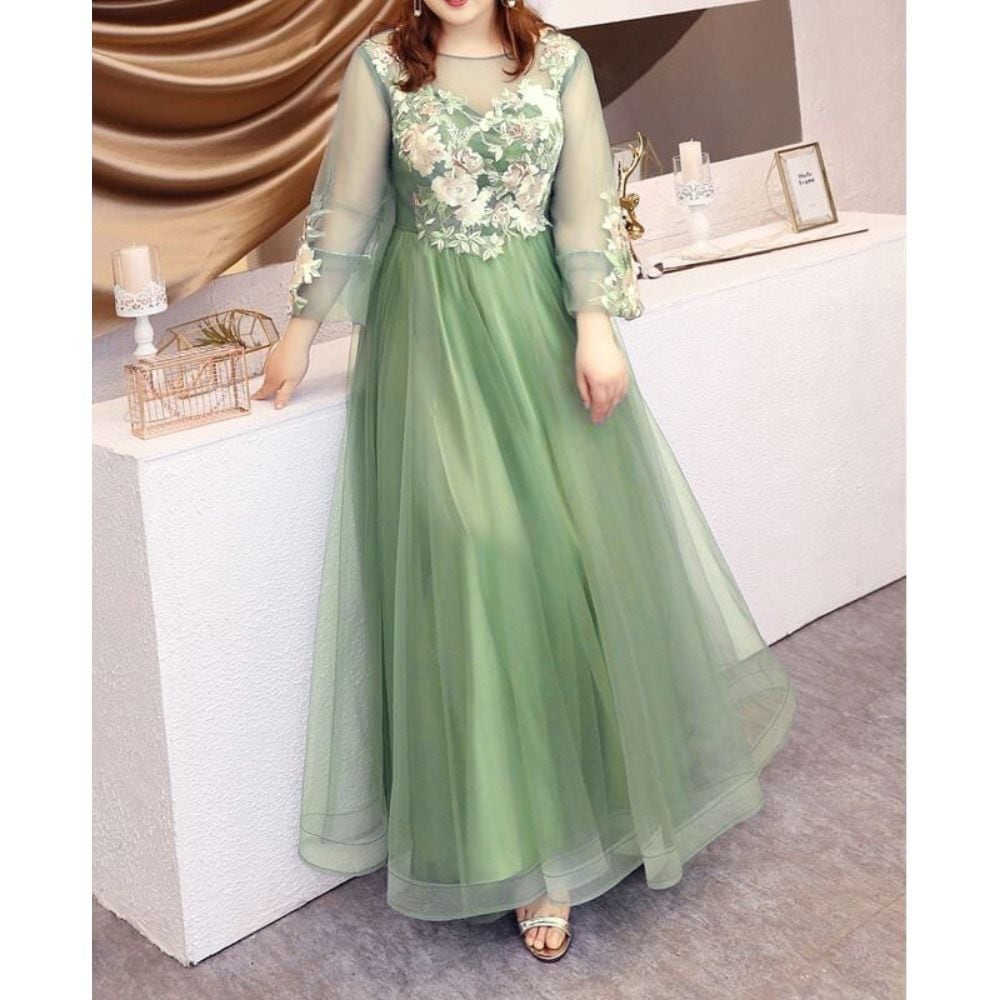 ナチュラルな印象のグリーンカラーにお花の繊細な刺繍が美しいロングドレス。