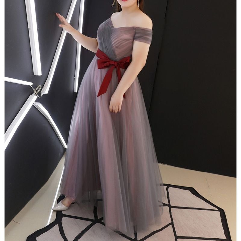 オフショルダーのデザインが、女性らしさを引き出すエレガントなドレスです。