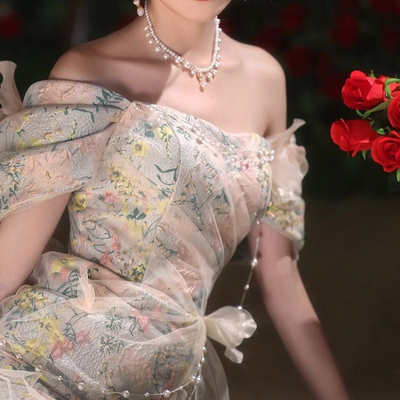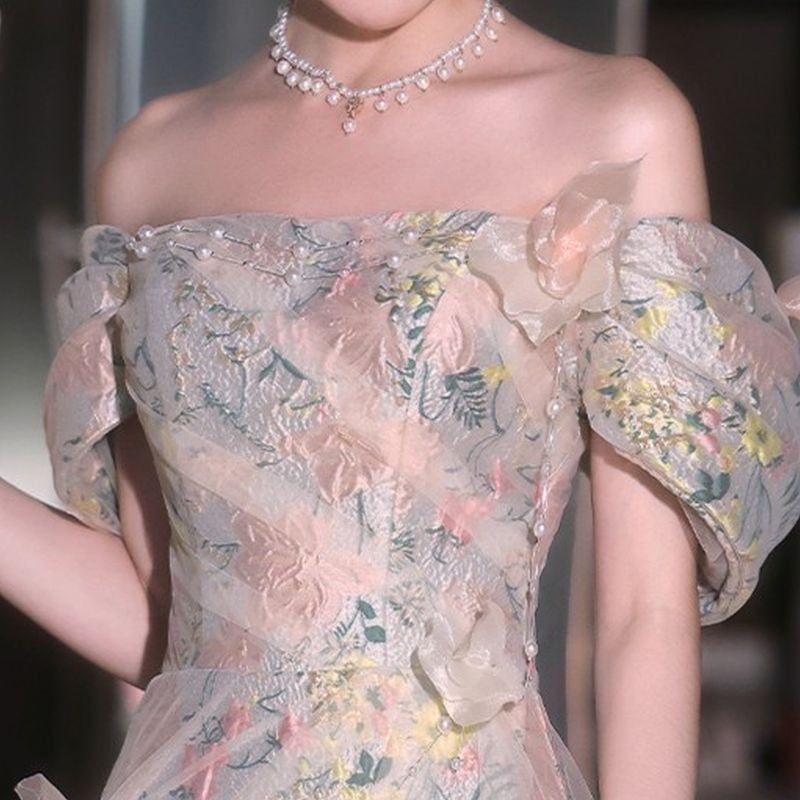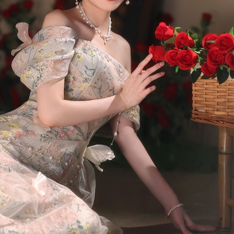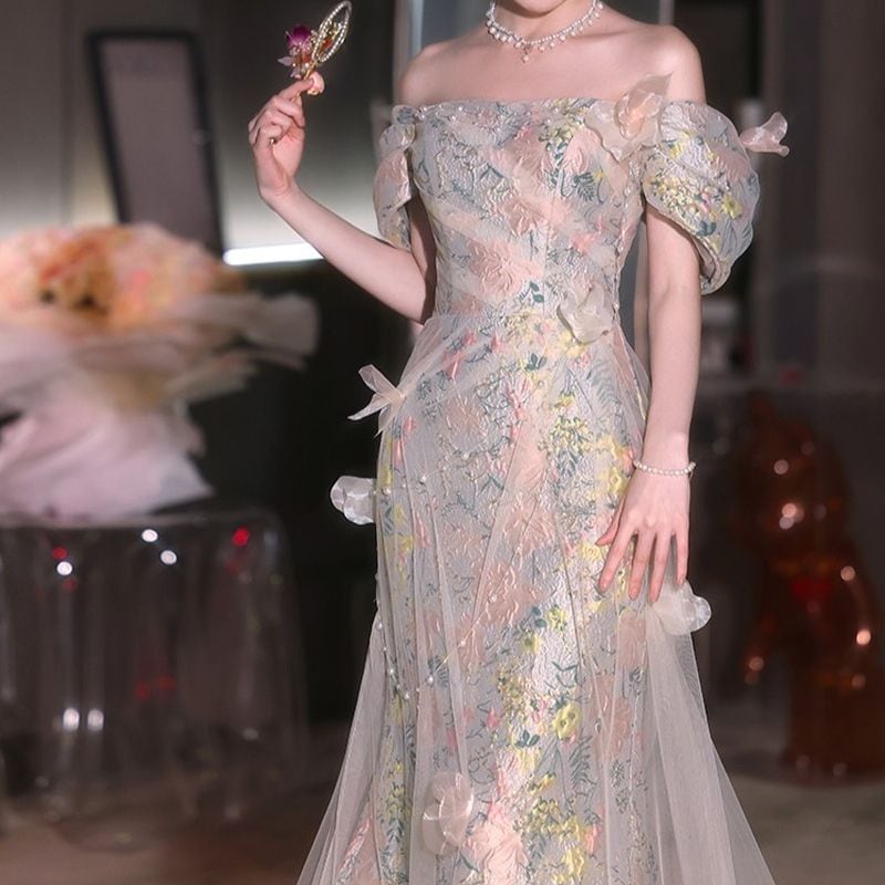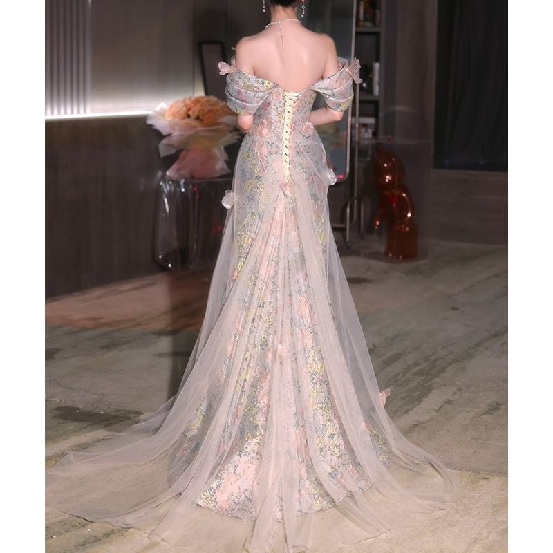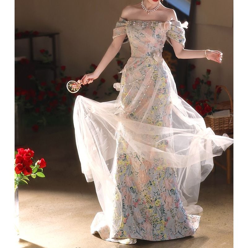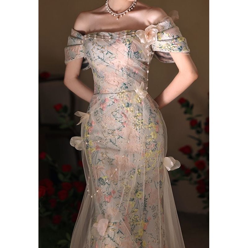 優美なオフショルダーデザインとマーメイドシルエットが、女性らしさを最大限に引き立てるロングドレスです。