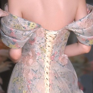 オーガンジー生地が優しく包み込み、ロングトレーンが歩くたびに美しく揺らめきます。
