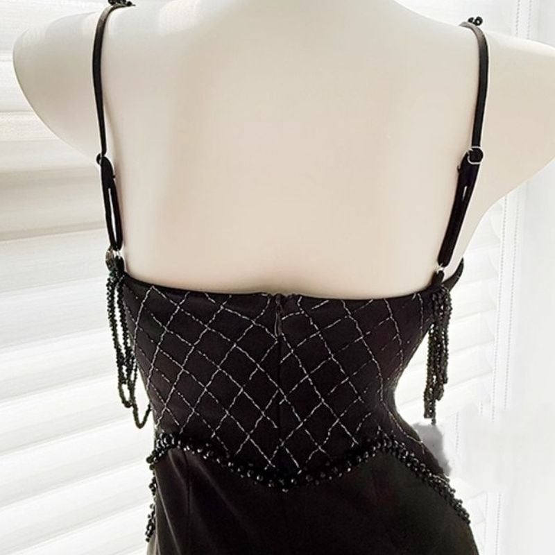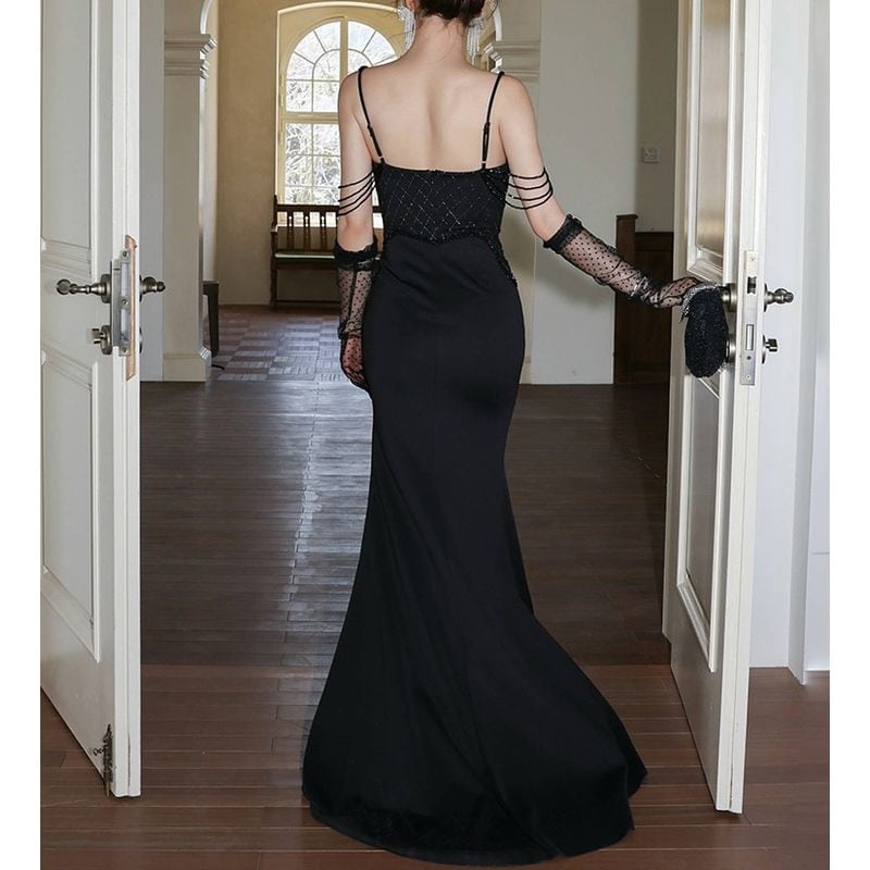 洗練されたマーメイドシルエットと華やかなビーズ装飾が魅力的なロングドレスです。