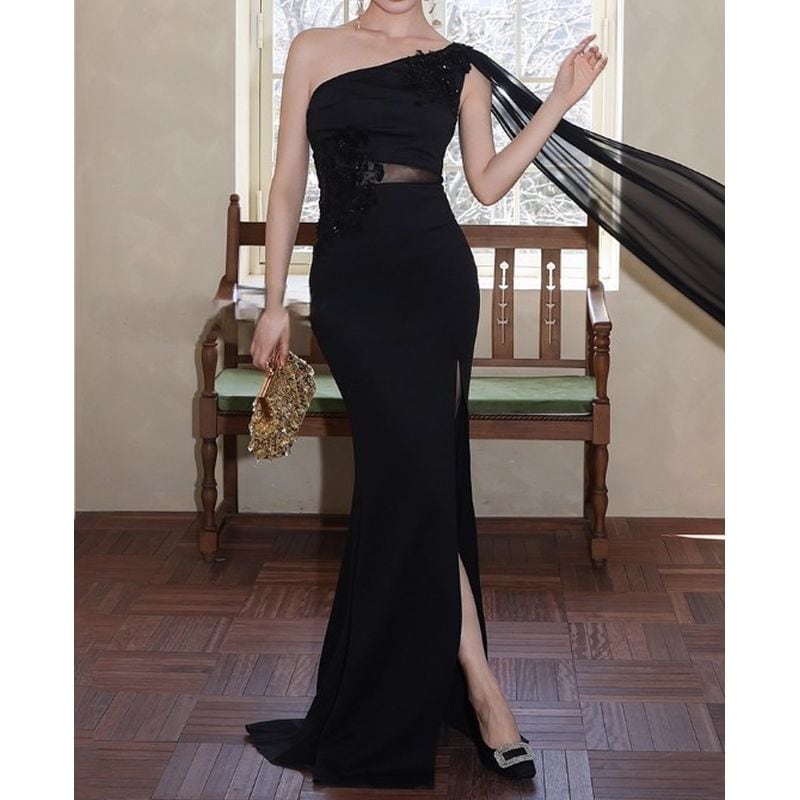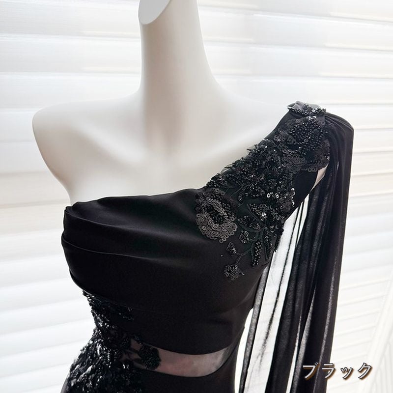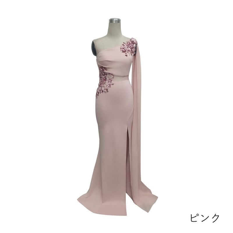 流れるようなワンショルダーのデザインが美しく魅了するロングドレスです。