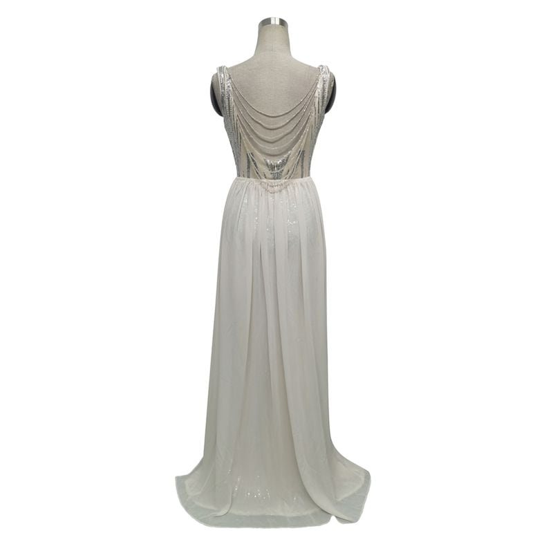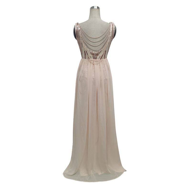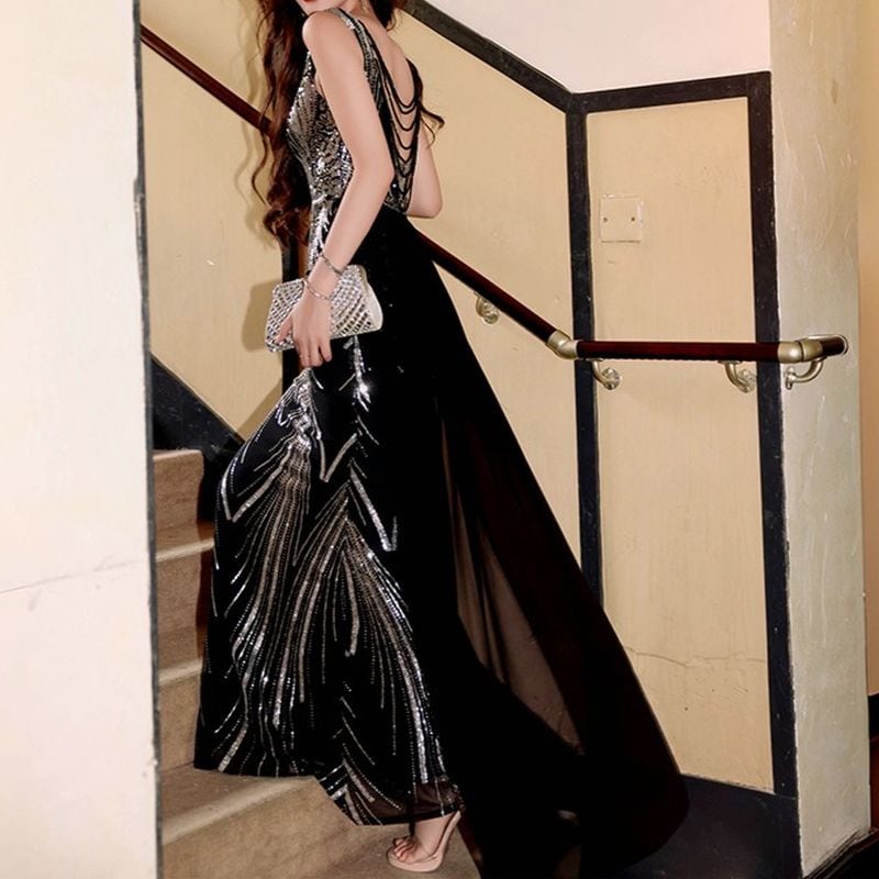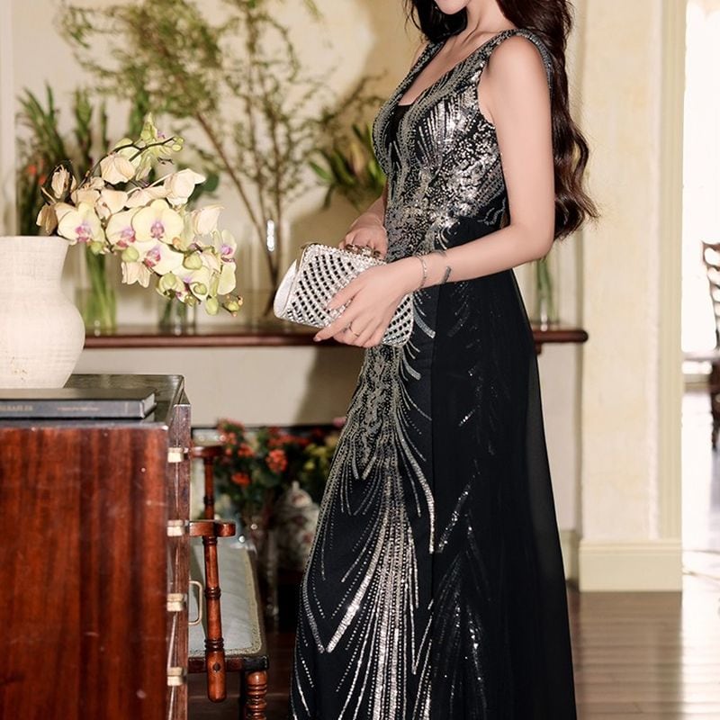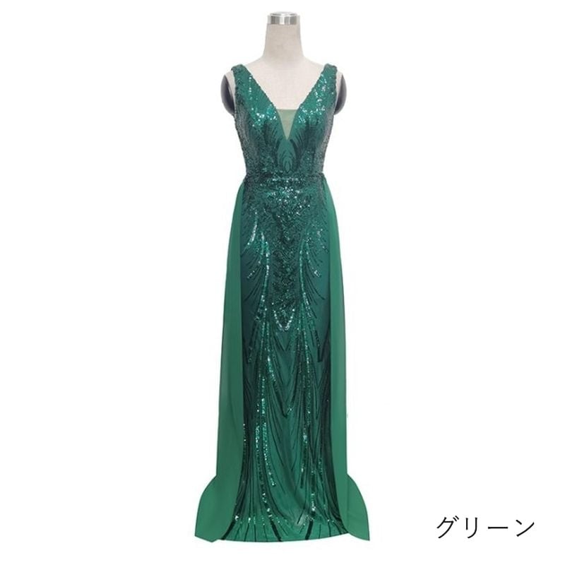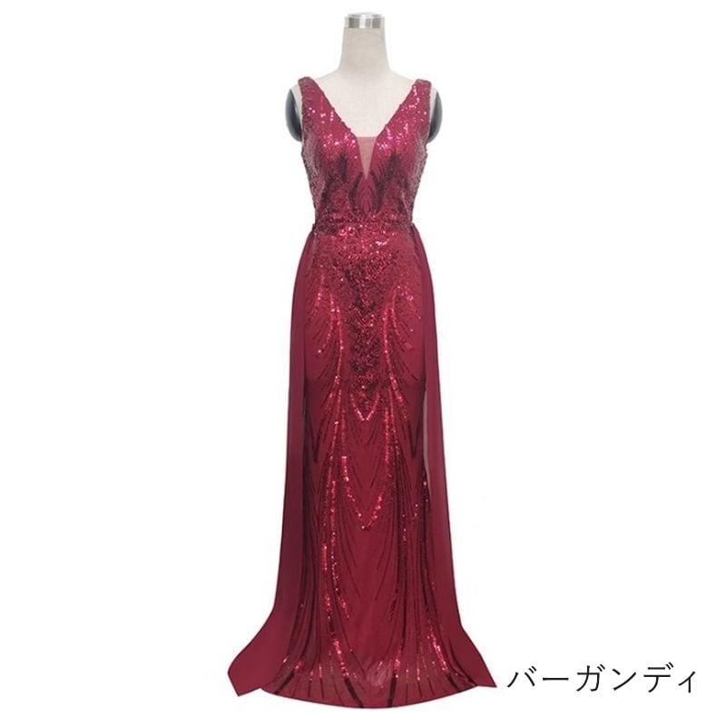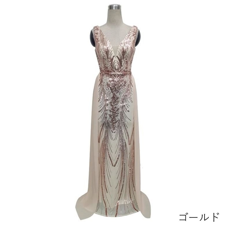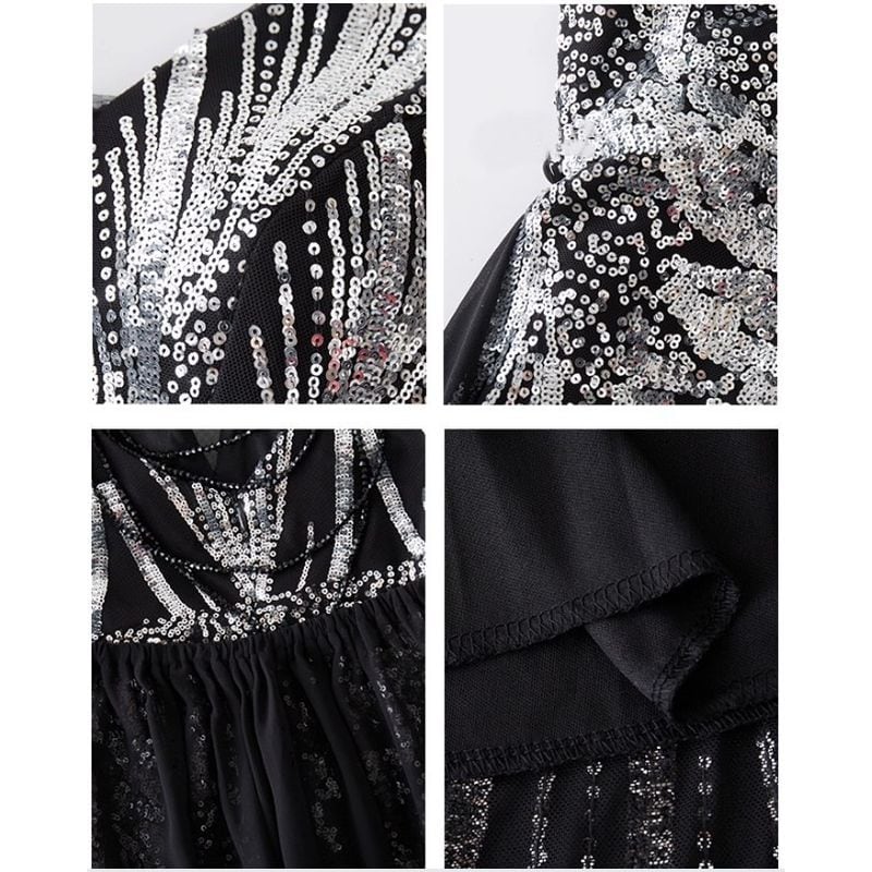Vネックデザインがデコルテを美しく見せ、豪華なスパンコール模様が華やかさをプラス。