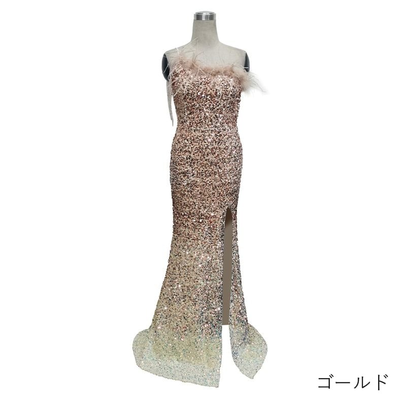 スパンコールの輝きが、パーティーシーンを華やかに彩るロングドレスです。