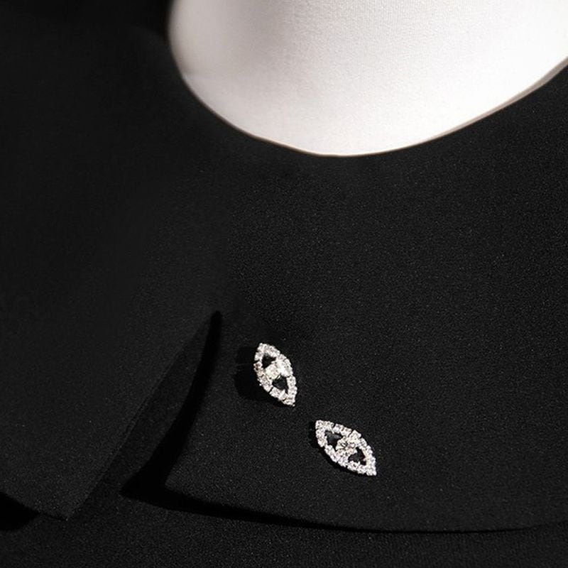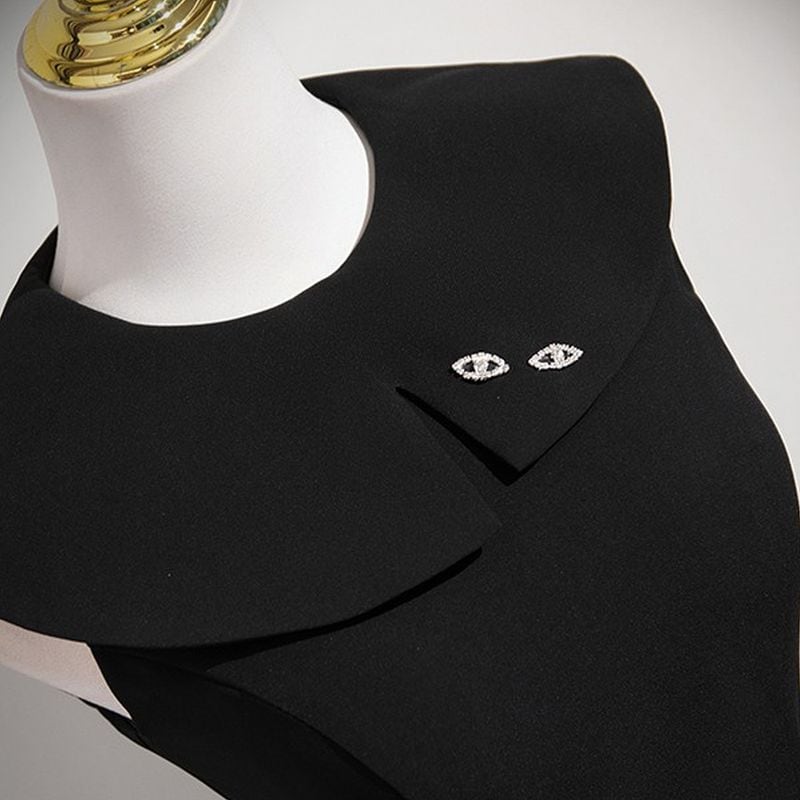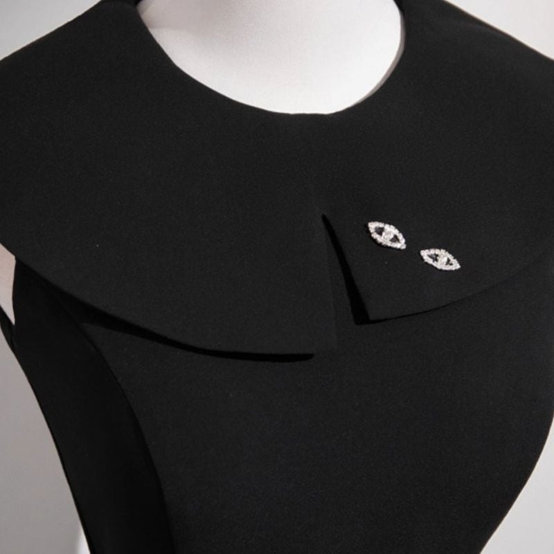 襟元にはさりげなくネコ目のビジュー。ウエストマークのデザインが、スタイルアップ効果を発揮し美しいシルエットを演出します。