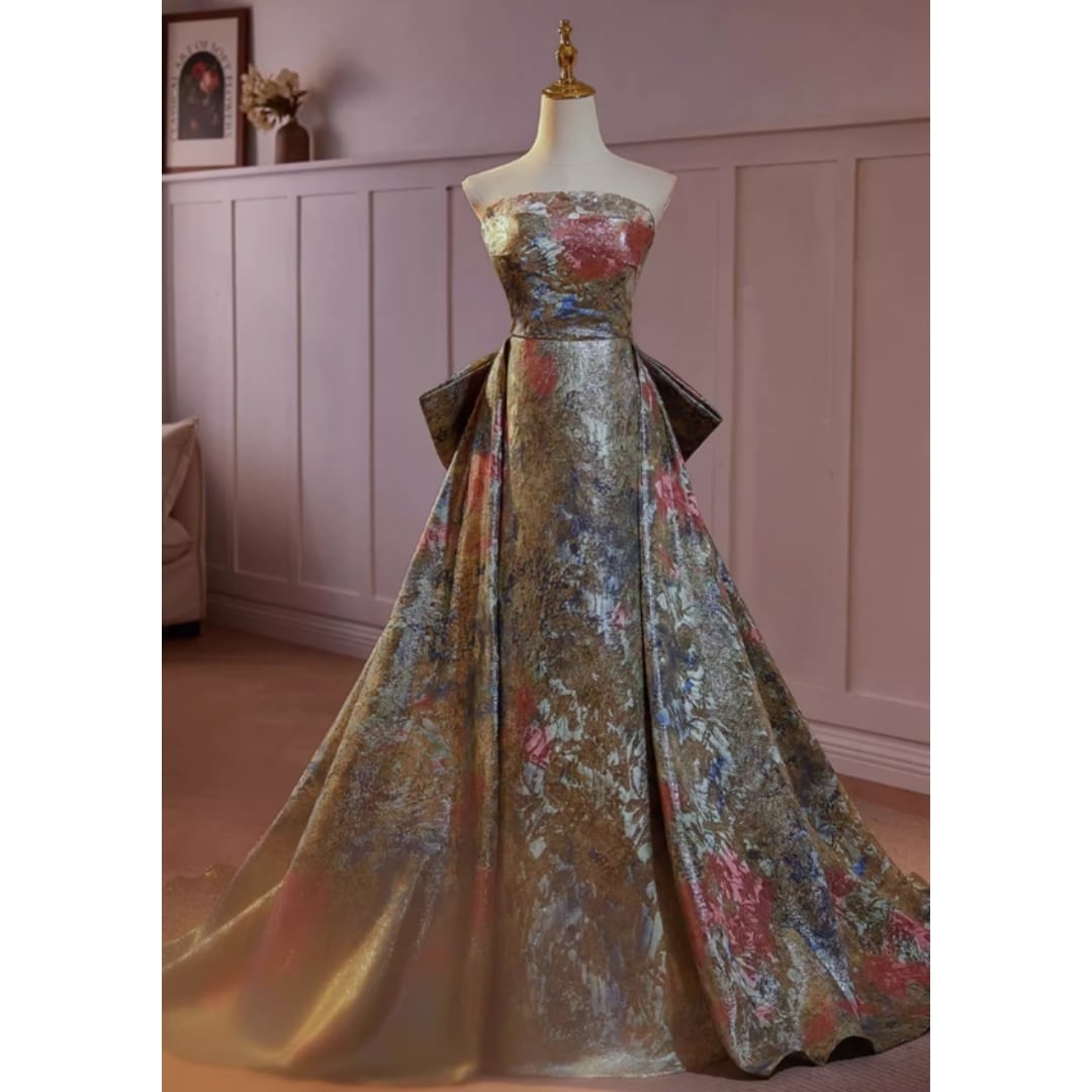 ゴールドカラーを基調としたカラーリングが美しく華やぐベアトップドレスです。