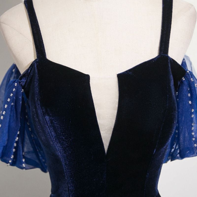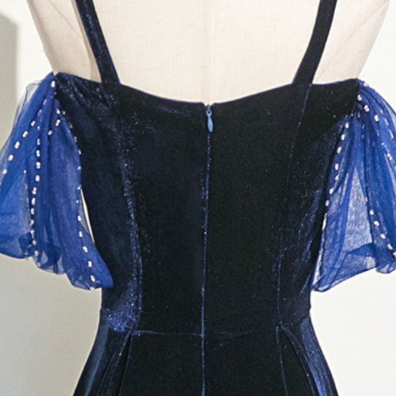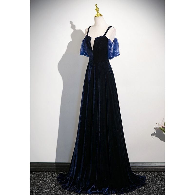 艶やかなネイビーカラーの生地がエレガントに魅了するロングドレスです。