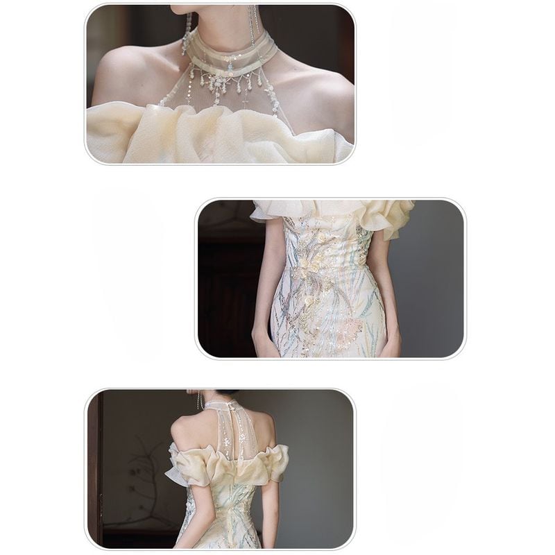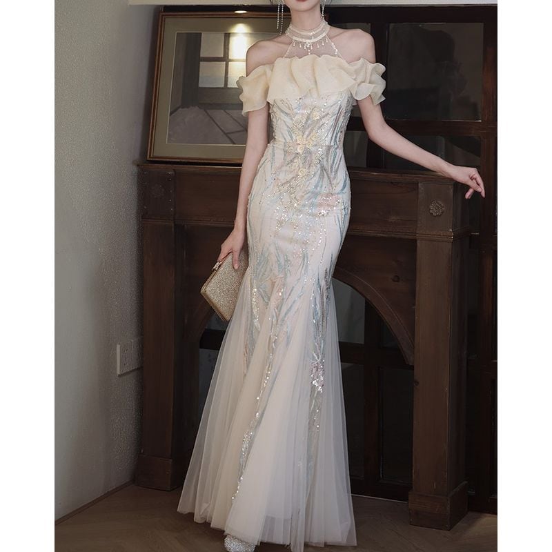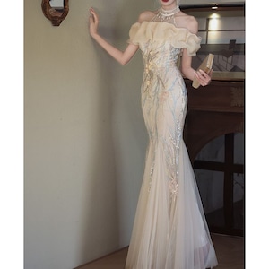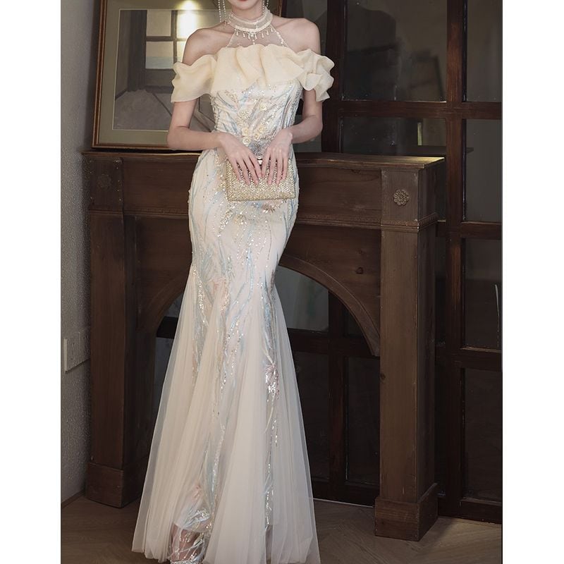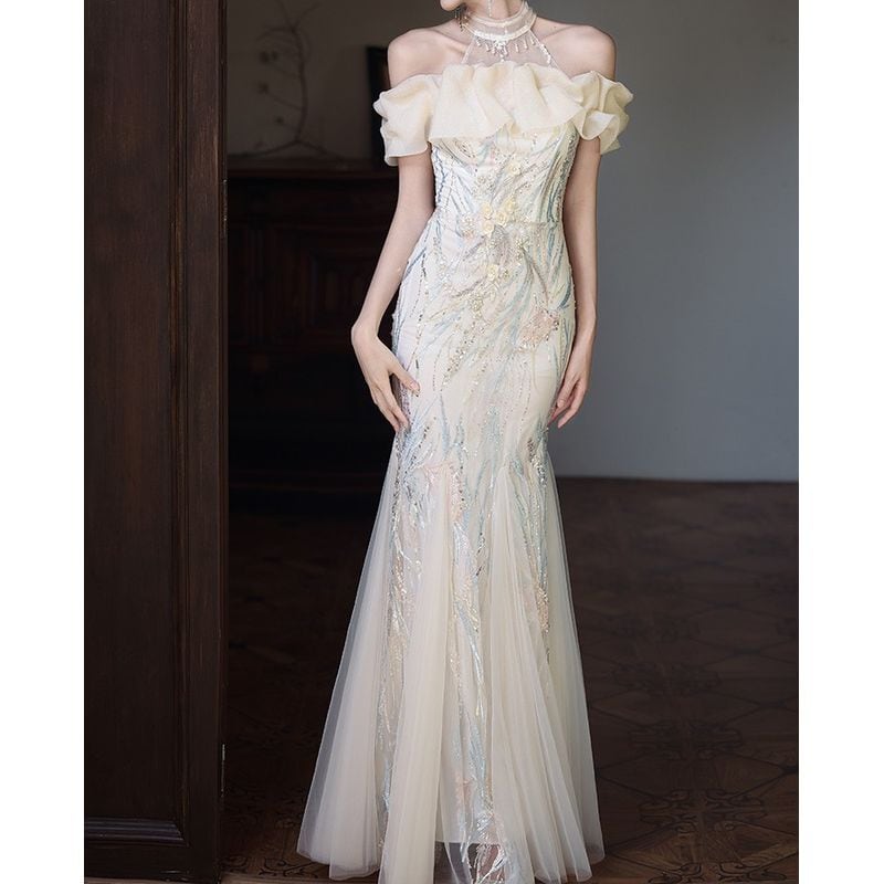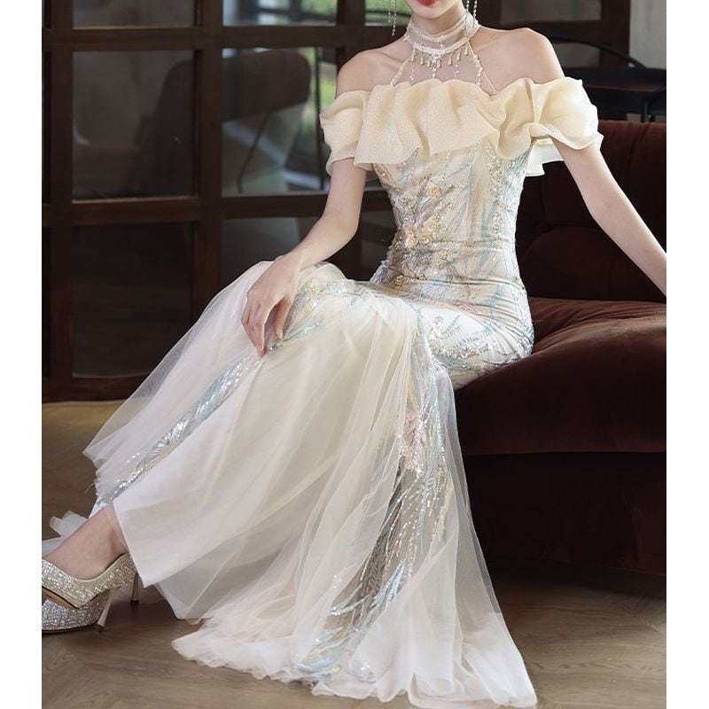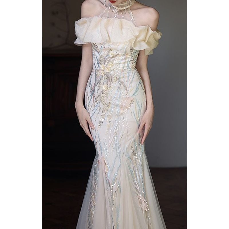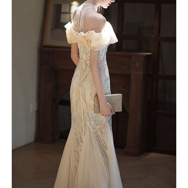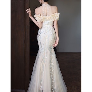 スパンコールの輝きを添え、美しいシルエットが魅力的なマーメイドドレスです。