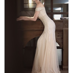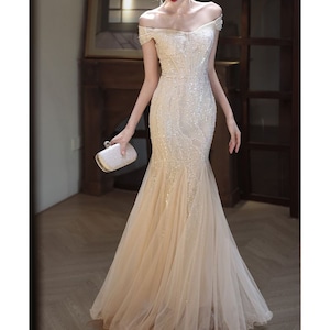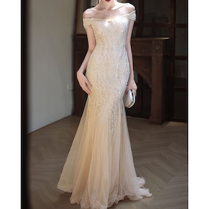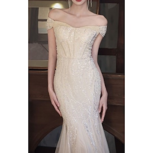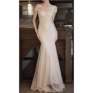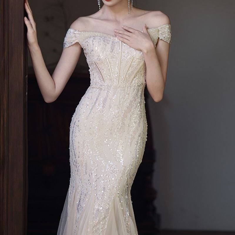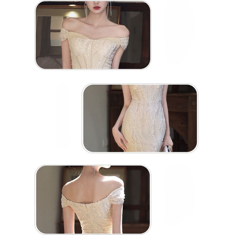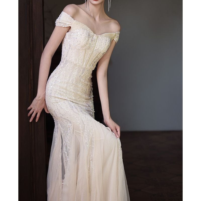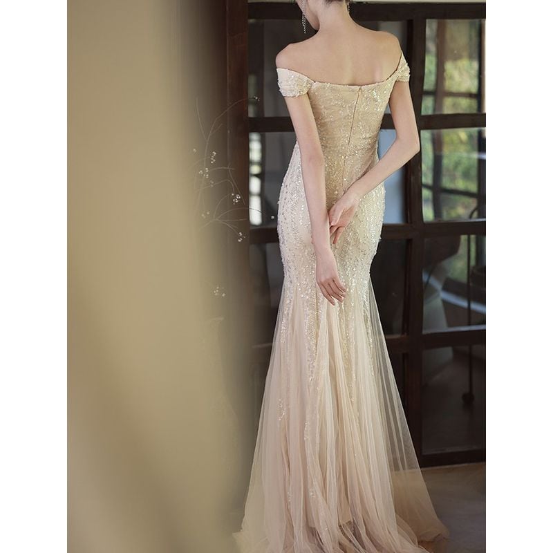 オフショルダーがデコルテを美しく魅せ、スパンコールの輝きが女性らしさを際立たせるロングドレスです。