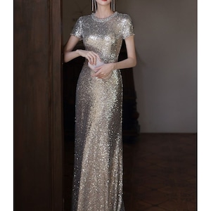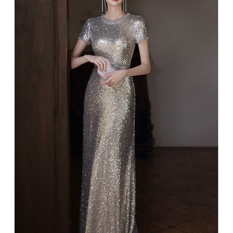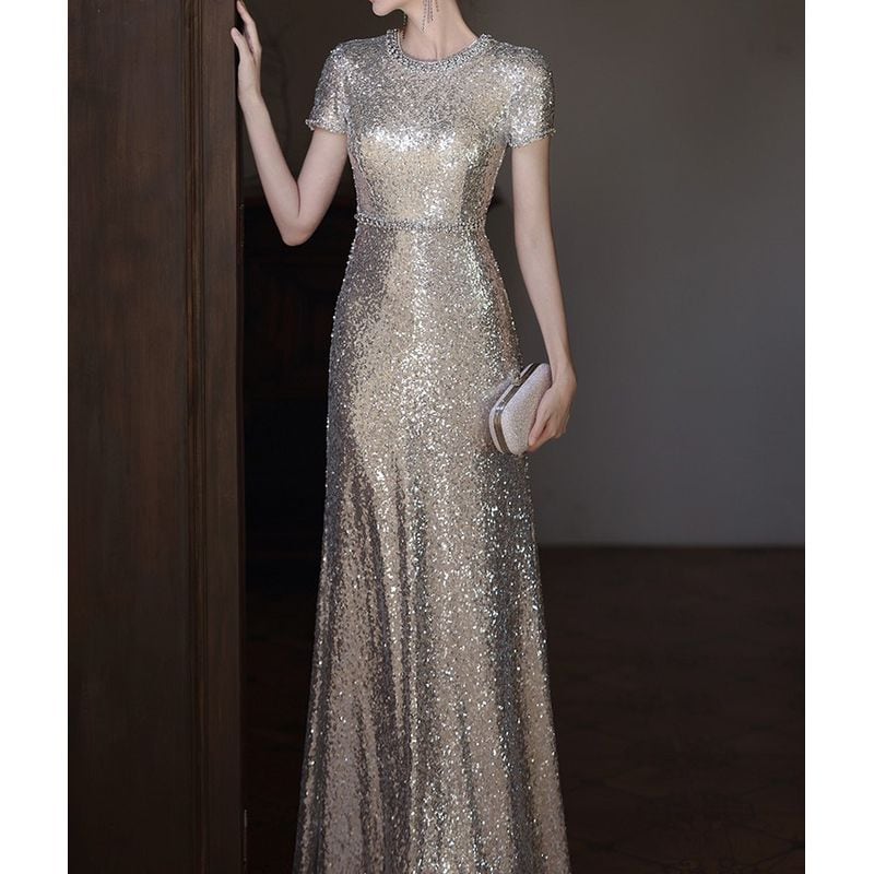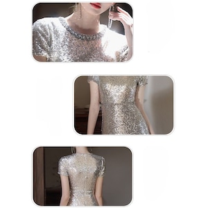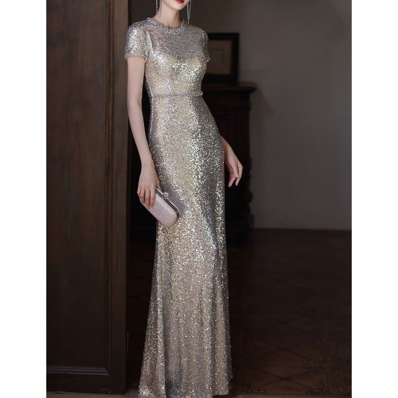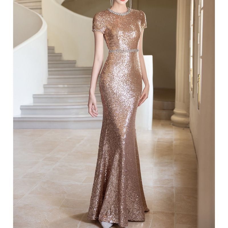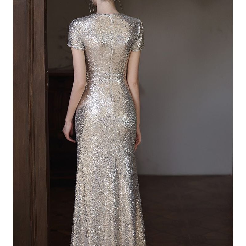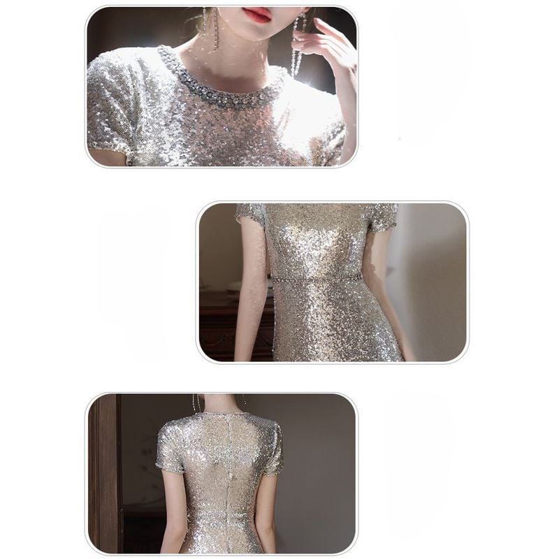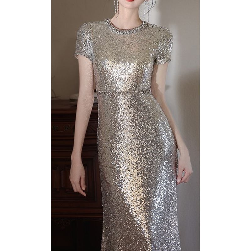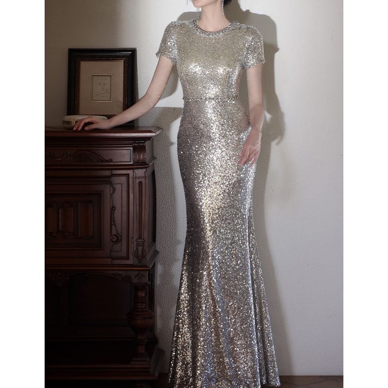 スパンコールハーフスリーブマーメイドドレス 2color D1738