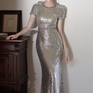 全体に施されたスパンコールが、光を浴びるたびに上品な輝きを放つロングドレスです。