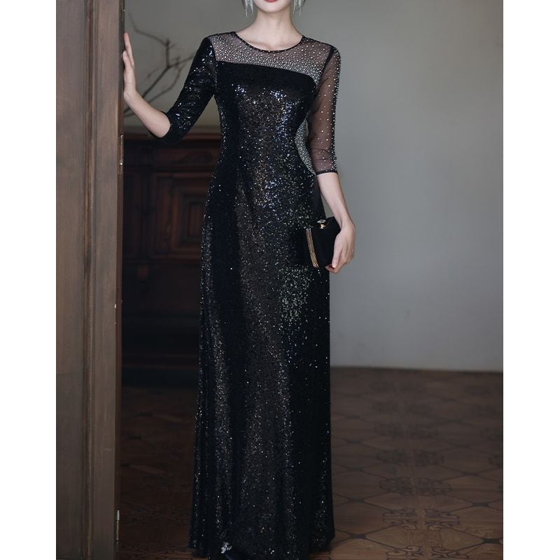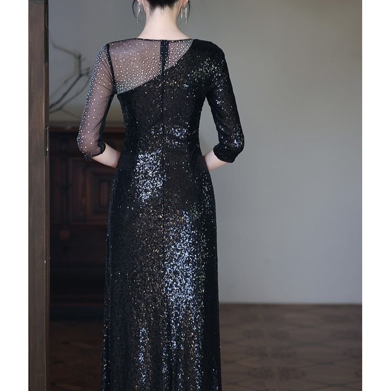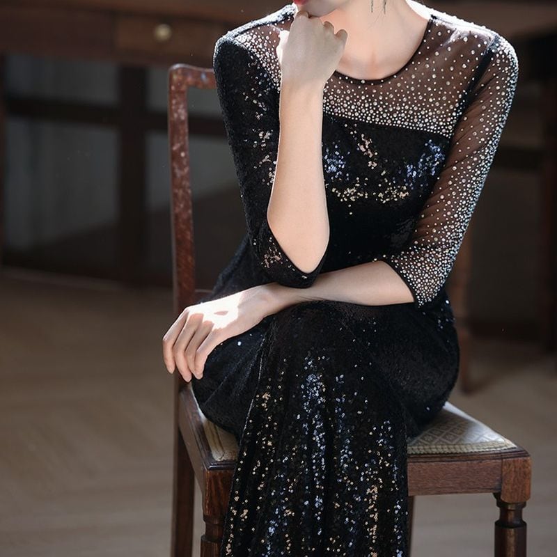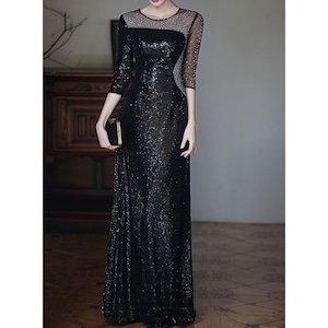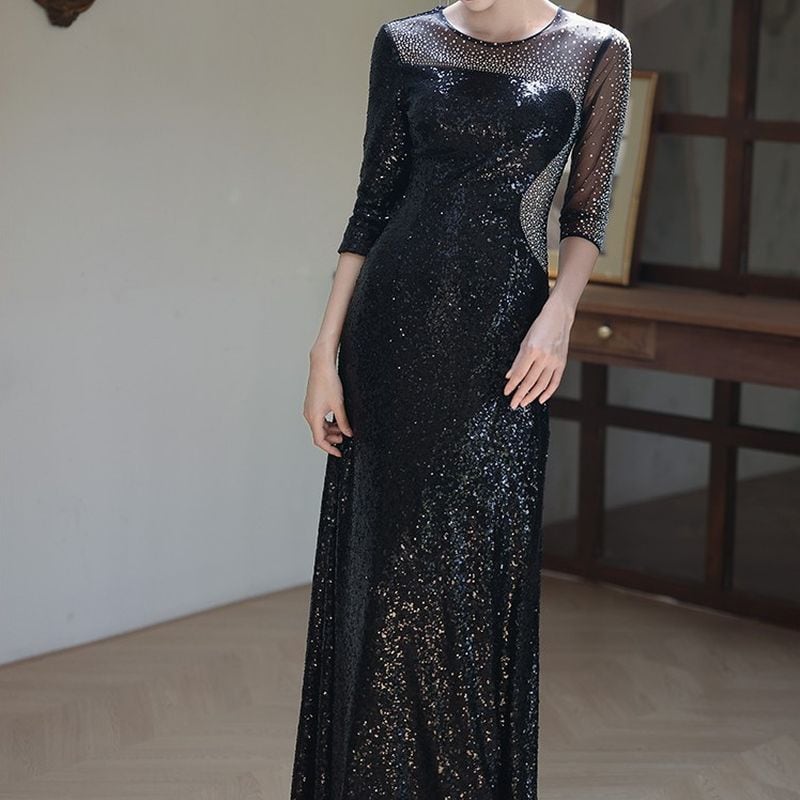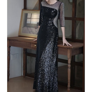 特別な瞬間を華やかに彩るスパンコールが美しいロングドレスです。