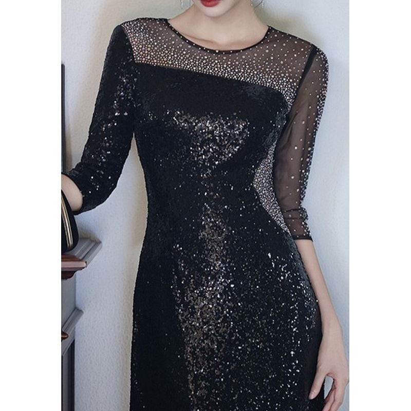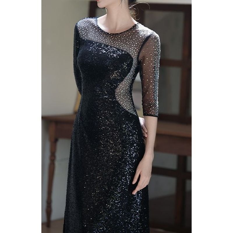 スパンコール七分袖スレンダードレス D1742