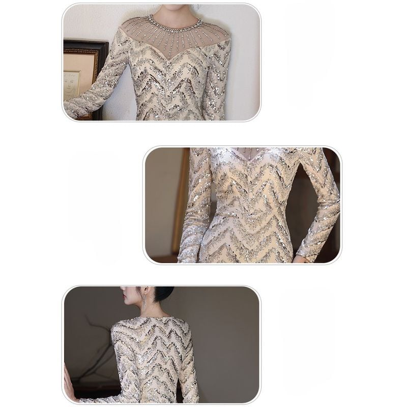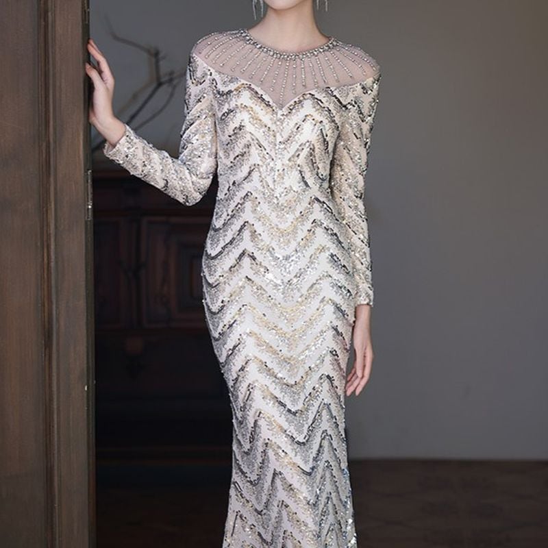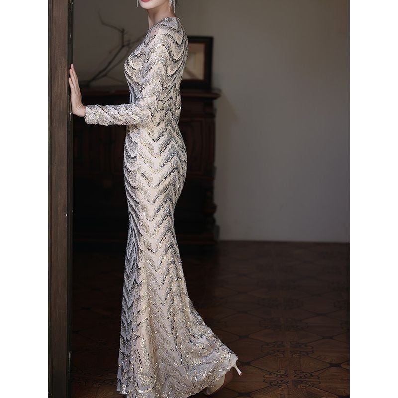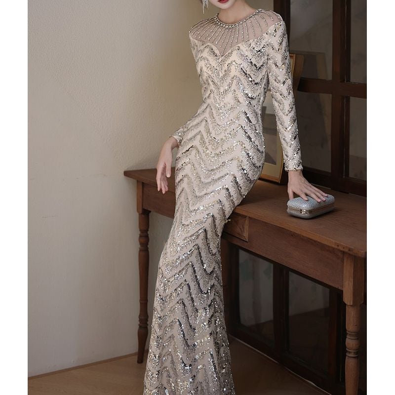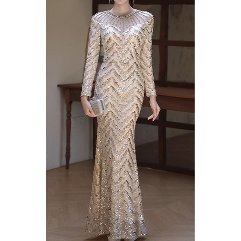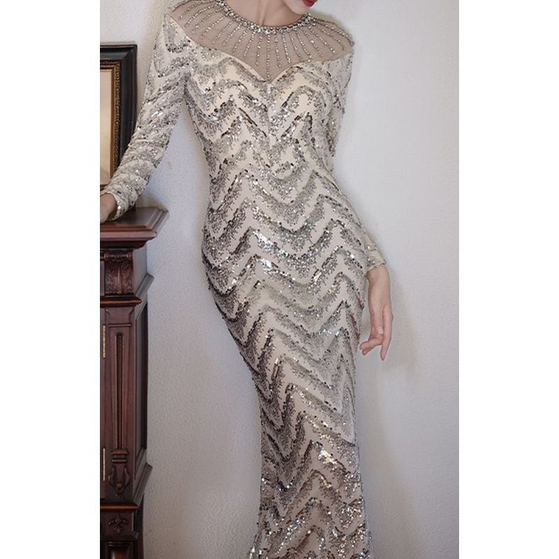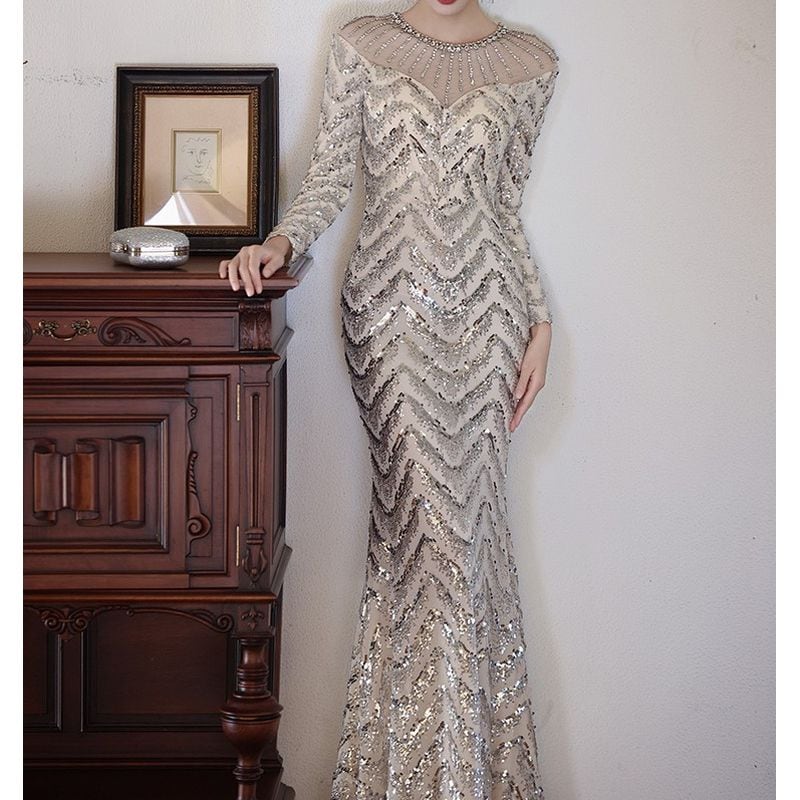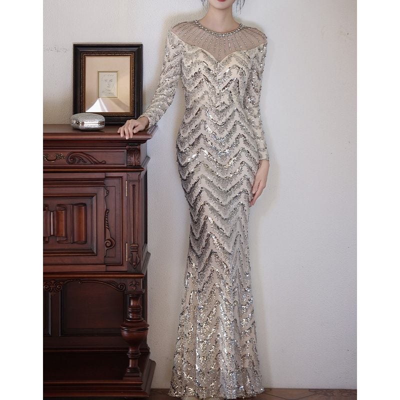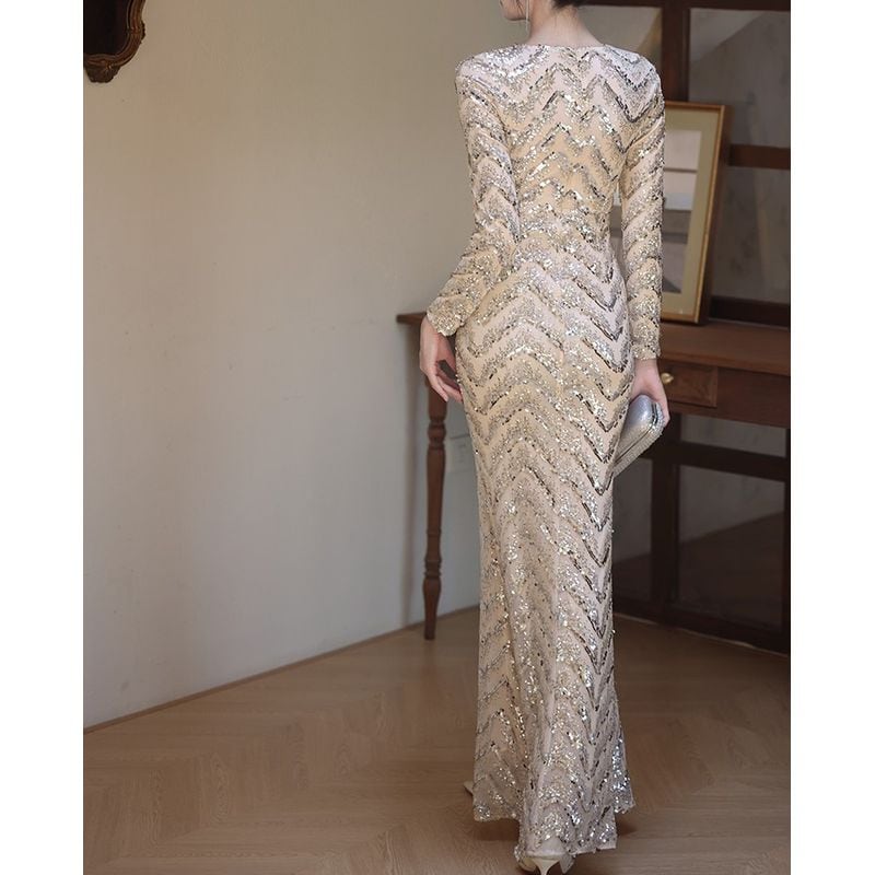 スパンコールロングスリーブマーメイドドレス D1744