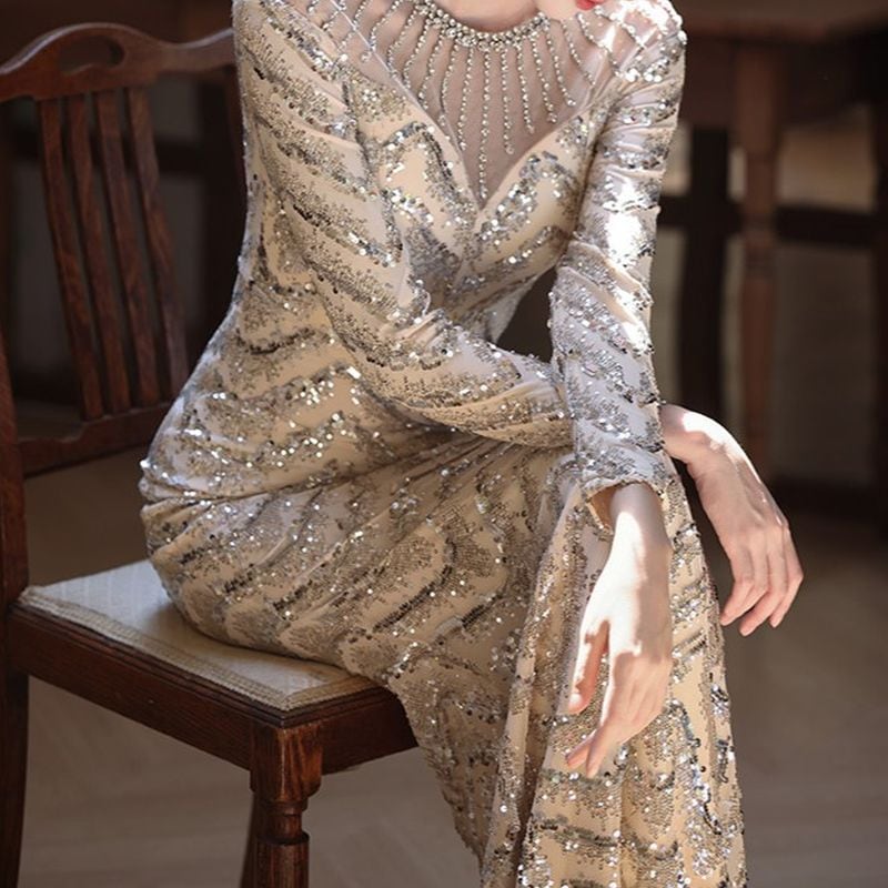 長袖デザインで上品さを演出しつつ、繊細なスパンコール模様が輝きを放ち、着る人をより美しく引き立てます。