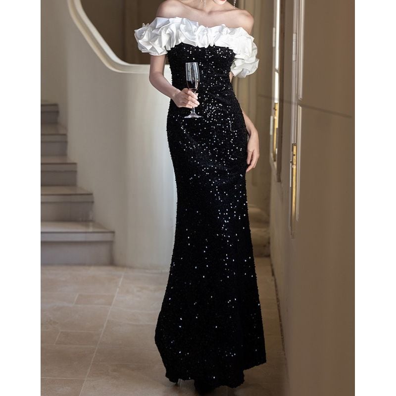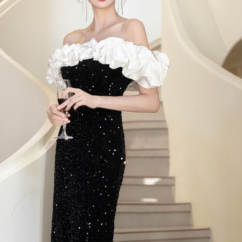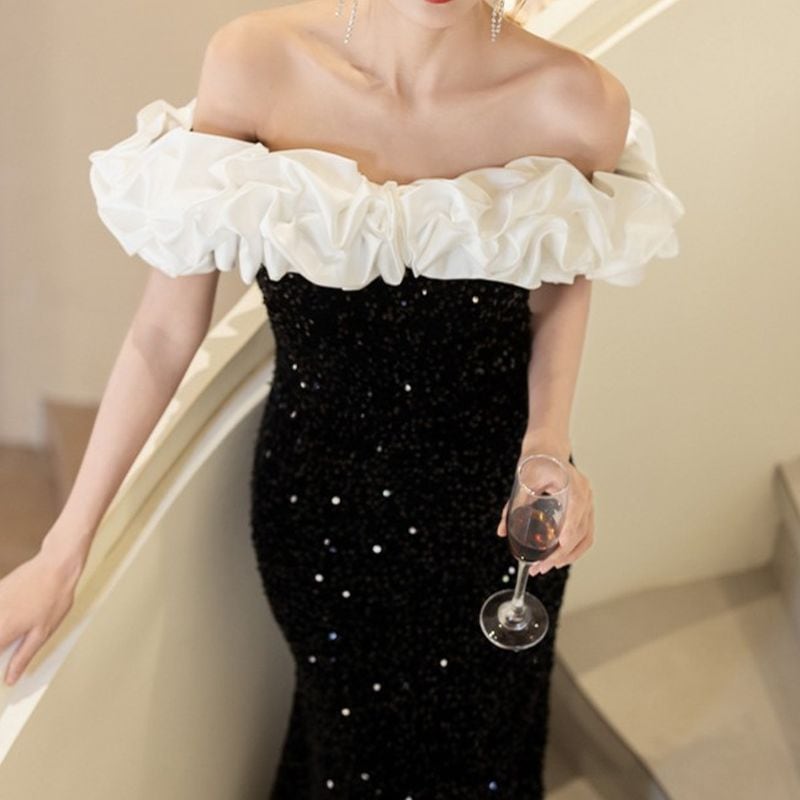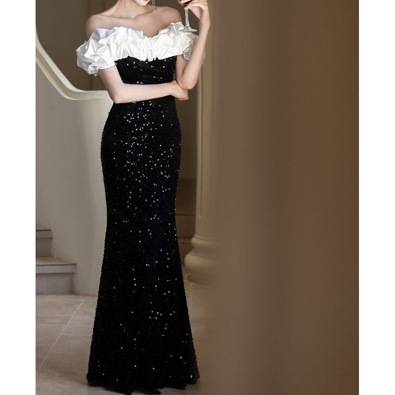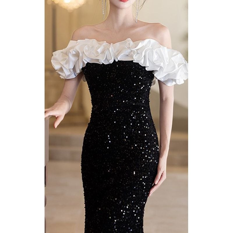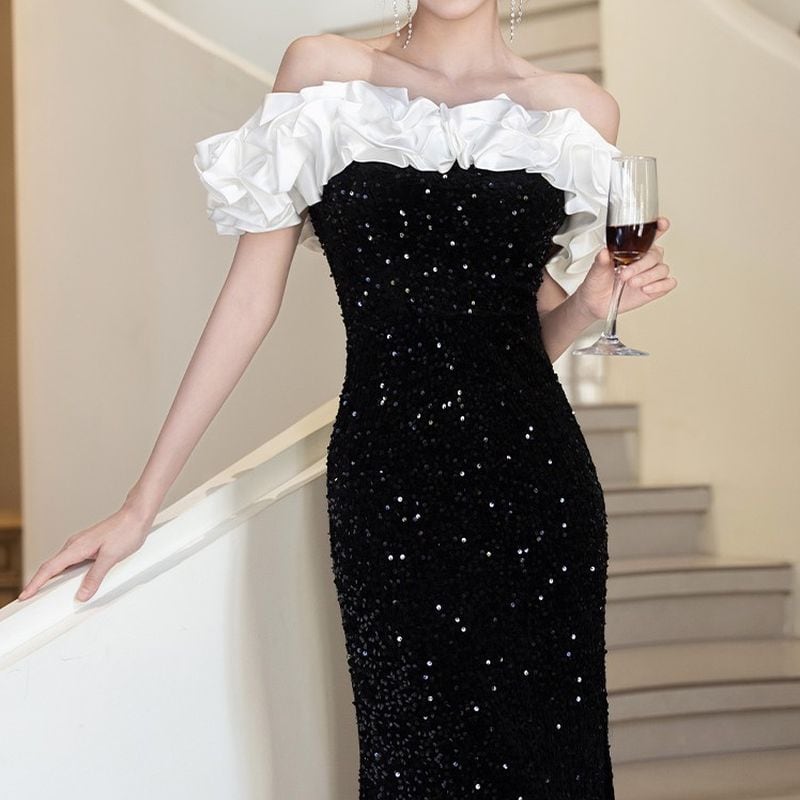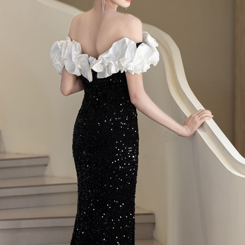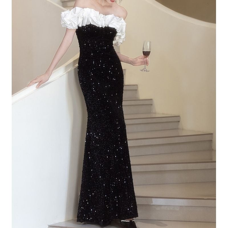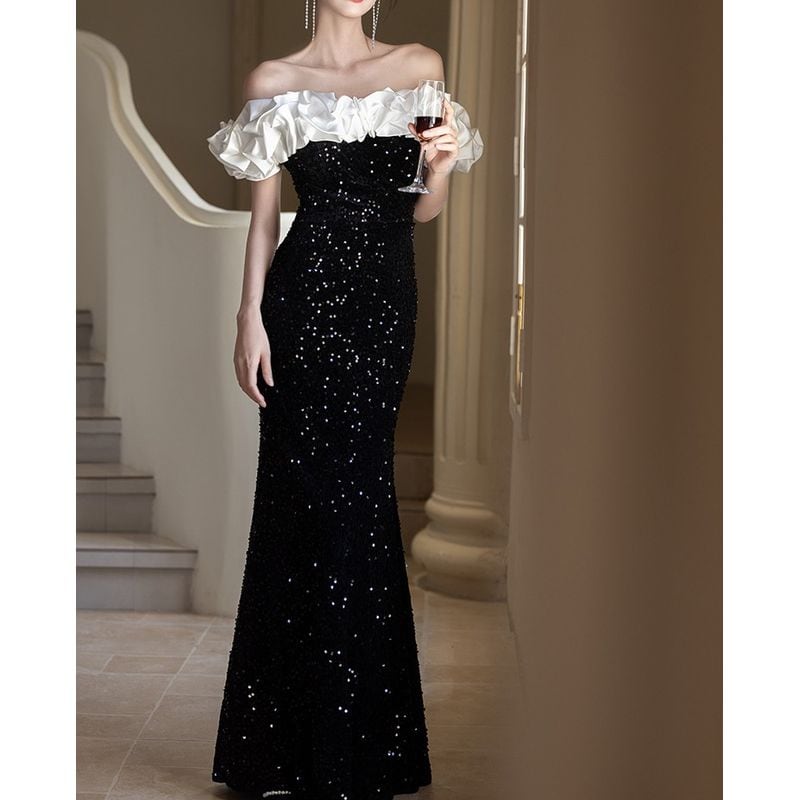 オフショルダーデザインがデコルテを美しく演出し、フリルデザインが華やかさを添えるロングドレスです。