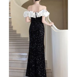 スパンコールが輝きを放ち、スレンダーなシルエットが洗練された美しさを表現。
