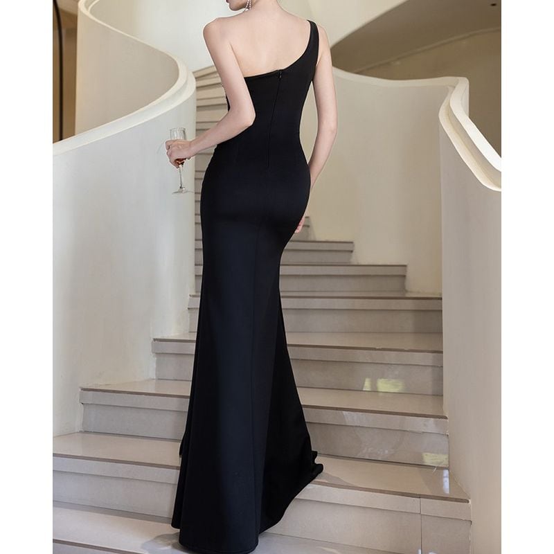 ワンショルダーデザインが、デコルテを美しく演出し優雅な雰囲気を際立たせるロングドレスです。