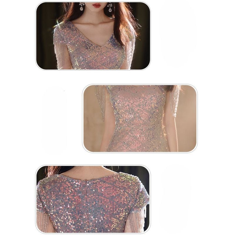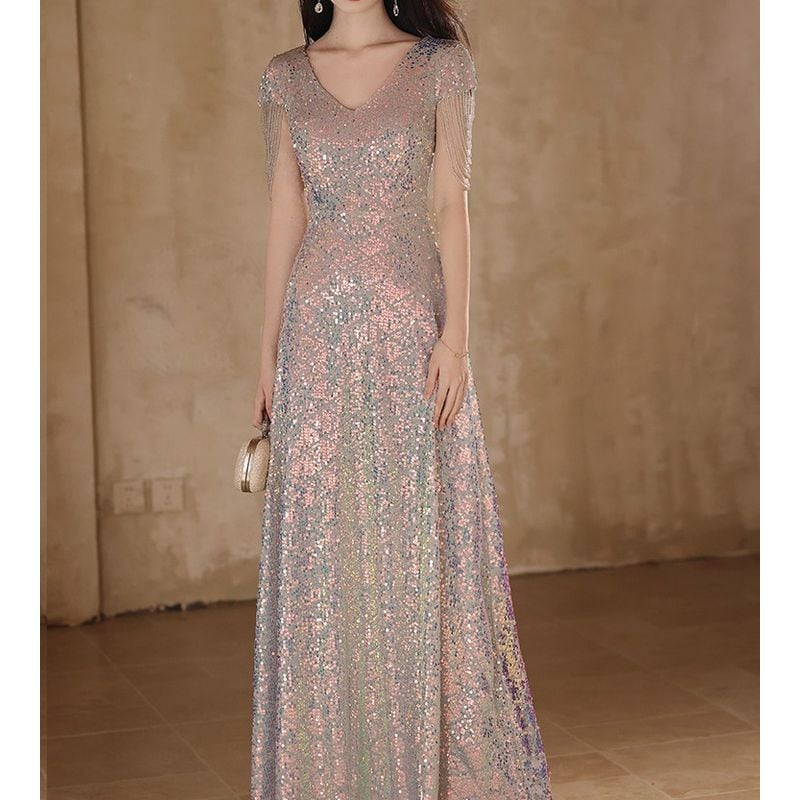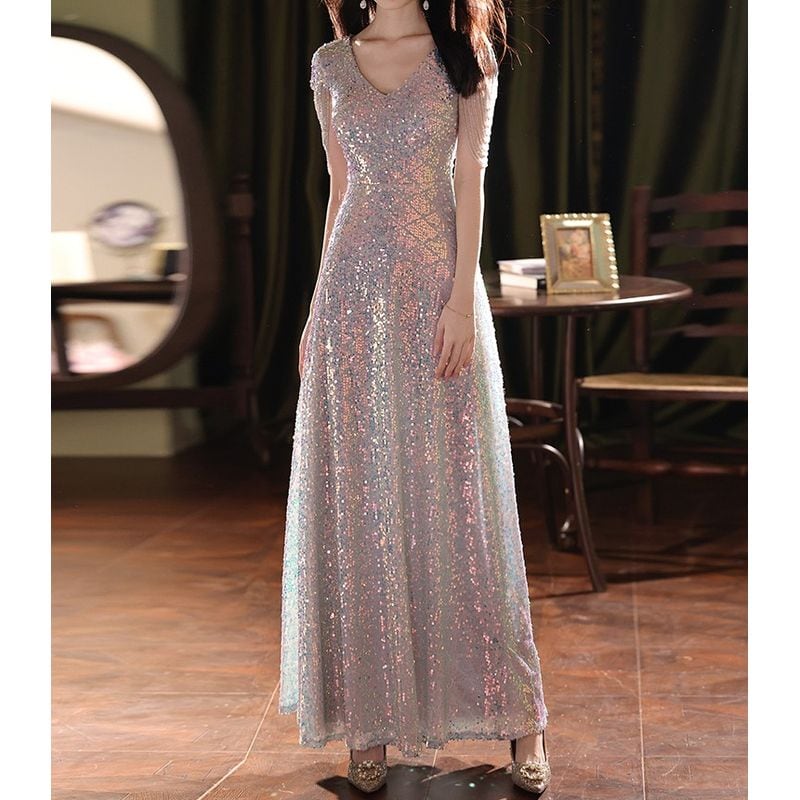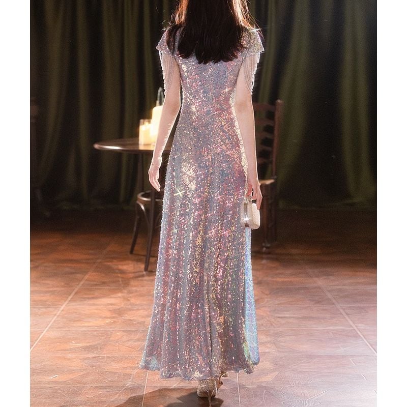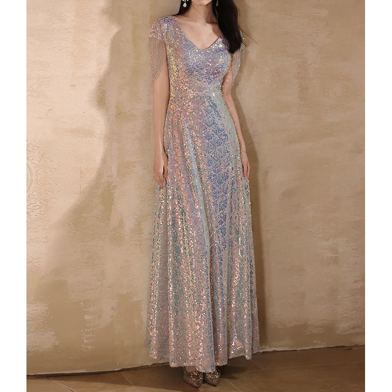 煌びやかな装いを演出するスパンコールデザインのロングドレスです。