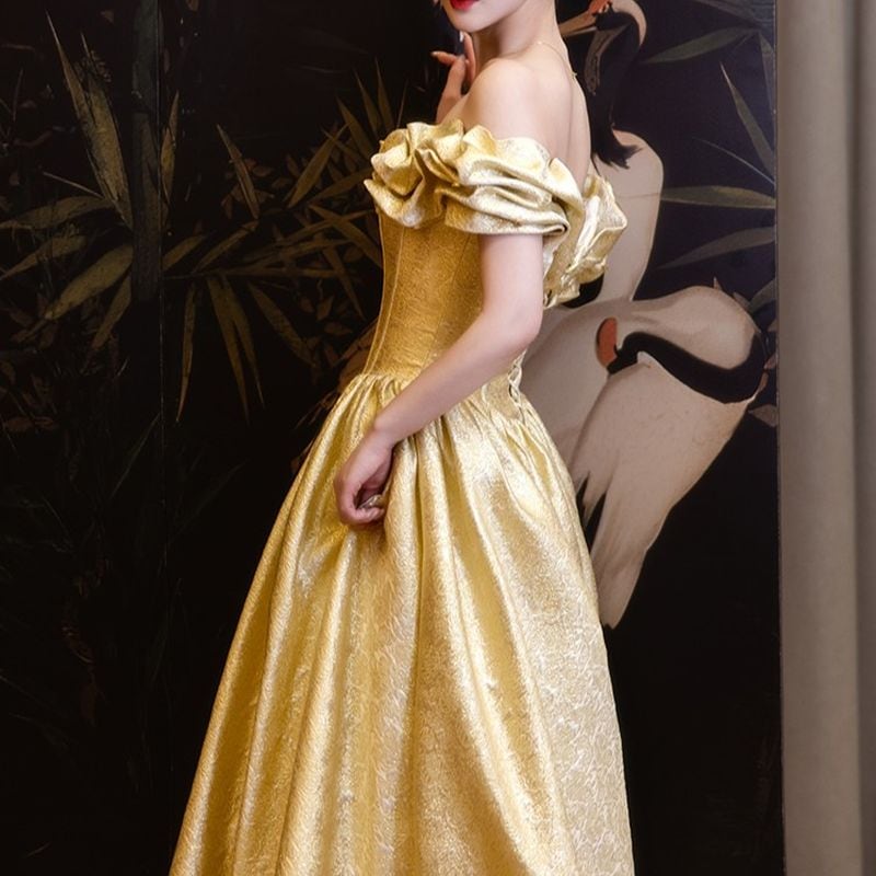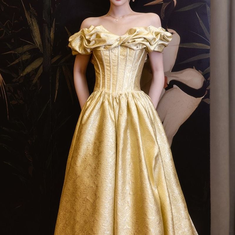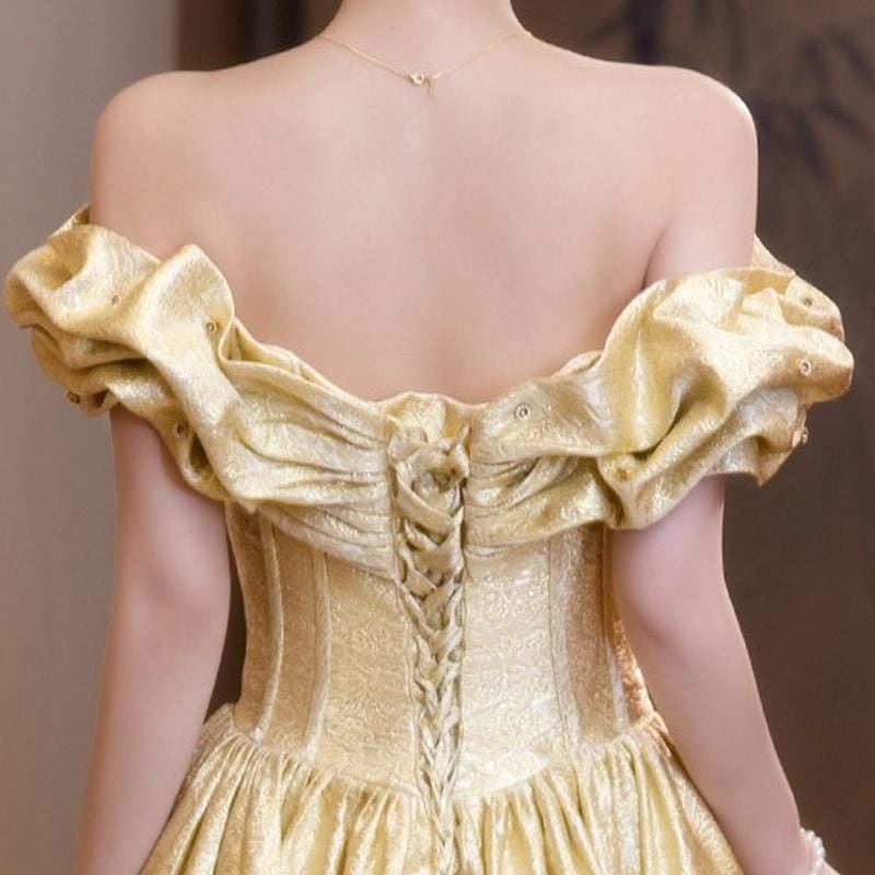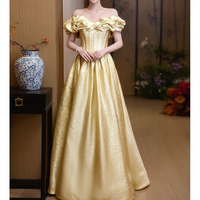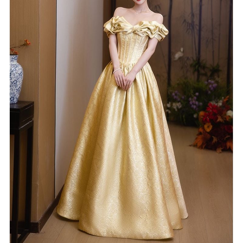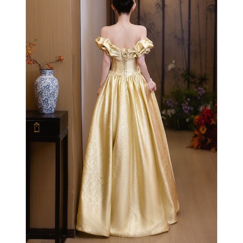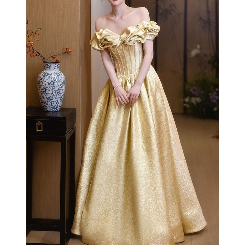 ボリューミーなオフショルダーデザインが顔回りを華やかに魅せるロングドレスです。