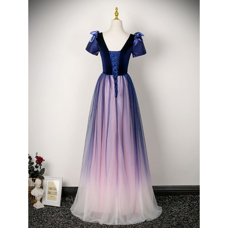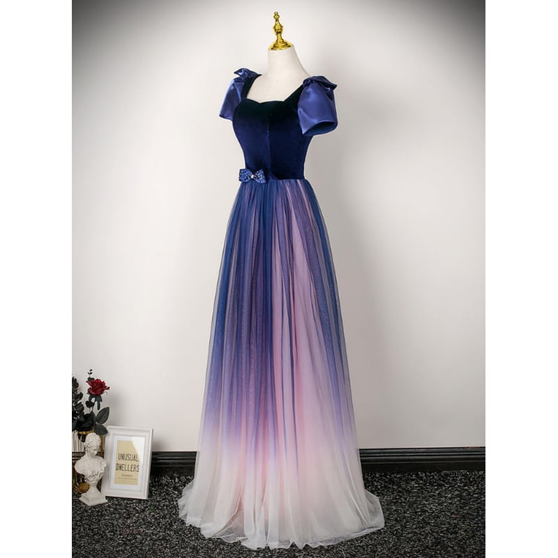 チュールを重ねたグラデーションカラーが目を惹くが美しいロングドレスです。