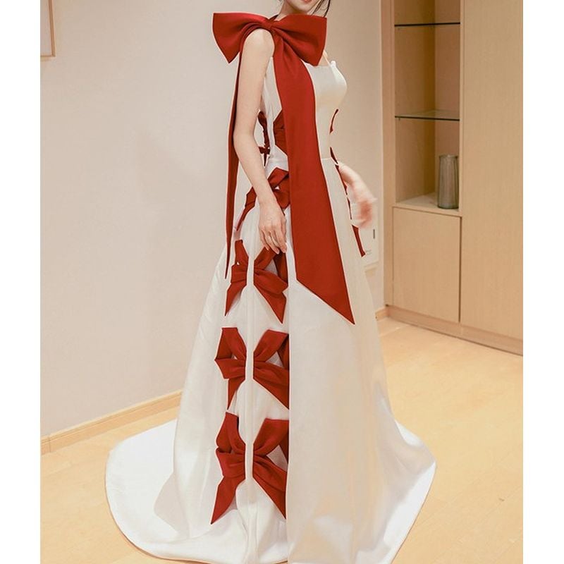 真っ白なドレスに映える、鮮やかな赤色のリボンが圧倒的な存在感を放つ個性的な一着です。