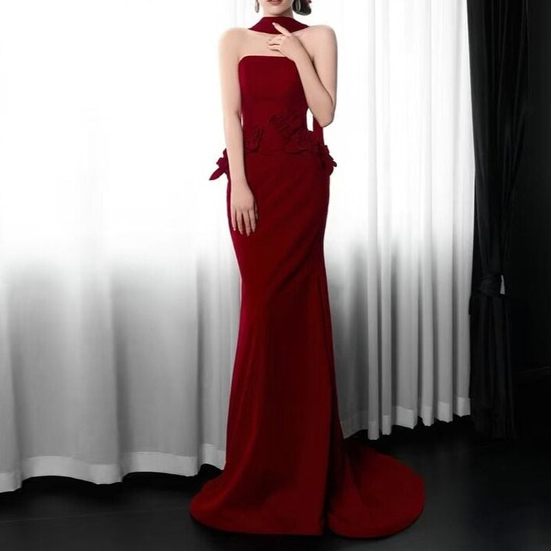 深みのあるワインレッドが目を引く、ベアトップデザインのドラマチックなロングドレスです。