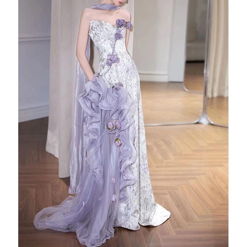 優雅な淡いパープルカラーが美しく映える、お花モチーフを贅沢にあしらった華やかなロングドレスです。