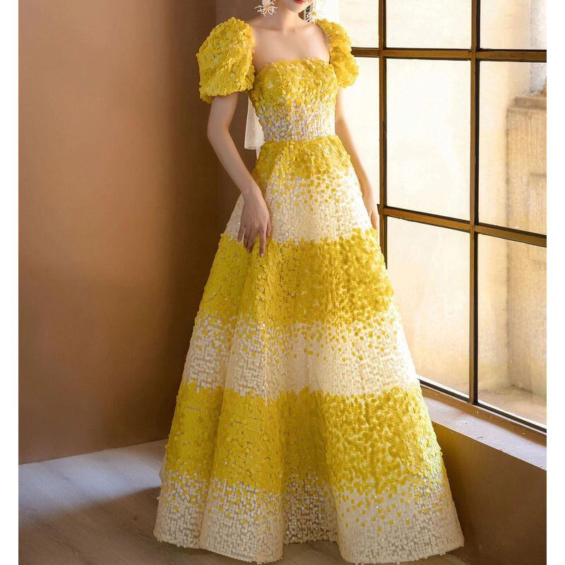 鮮やかなイエローからホワイトへと溶け込むような、美しいボーダーグラデーションが目を引く主役級のロングドレスです。