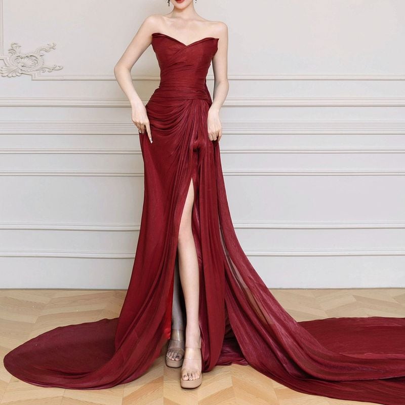 真っ赤なカラーが視線を釘付けにする、洗練されたベアトップデザインのスレンダーロングドレスです。