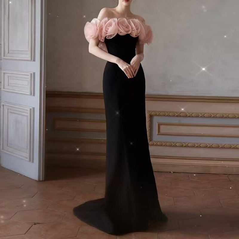 シックなブラックのスレンダーシルエットに、淡いピンクのお花モチーフが美しく映えるロングドレスです。