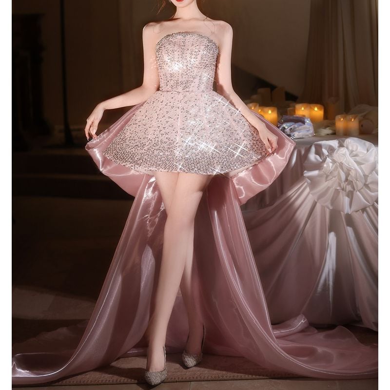 スパンコールを散りばめた、愛らしいピンクカラーのビスチェドレスです。