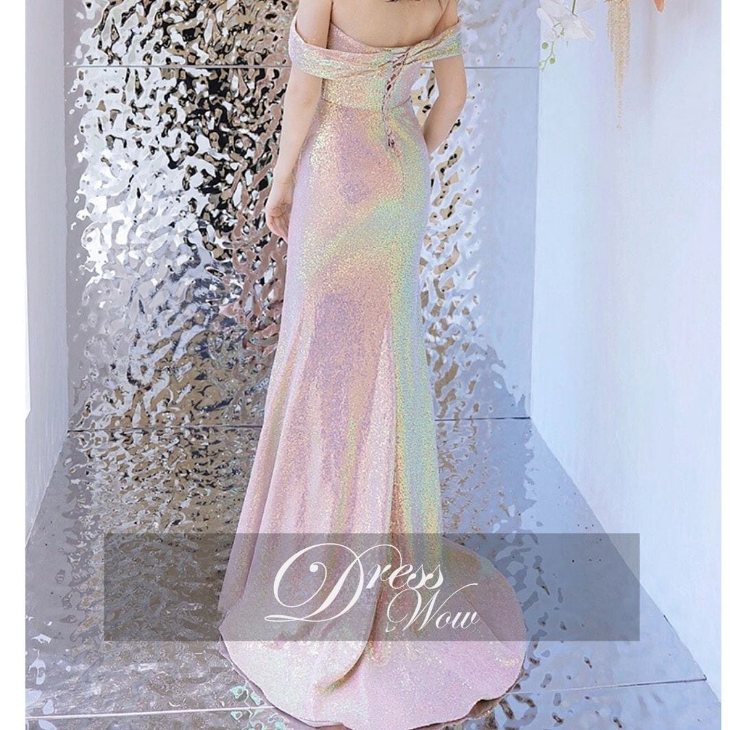 虹色に反射するスパンコールが360°華やかなパーティードレスです。
