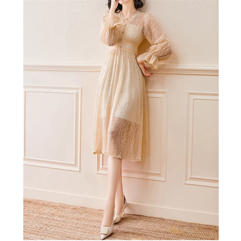 レース生地を重ね、スパンコールで輝きを加えたパーティードレスです。