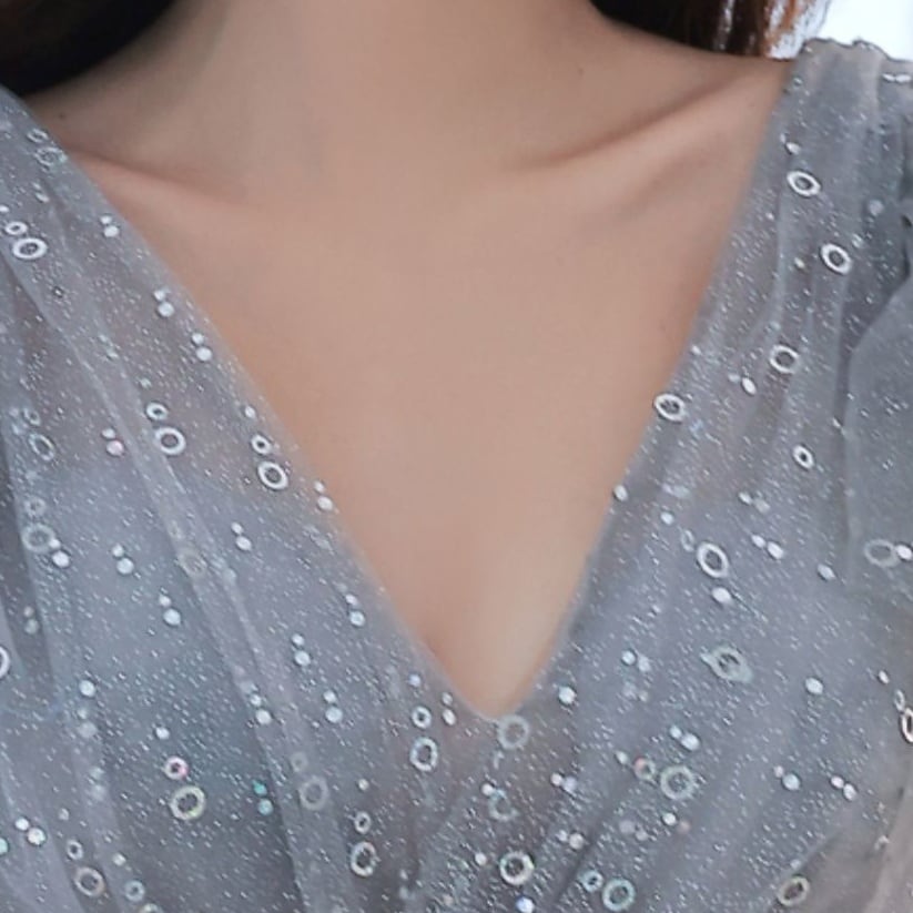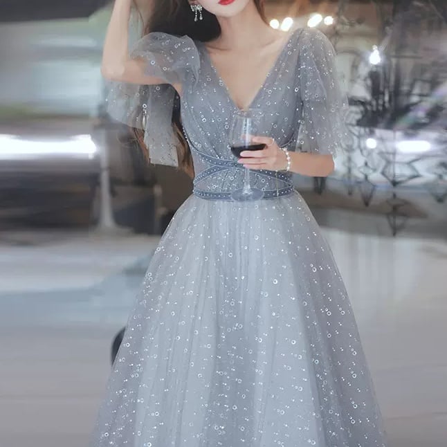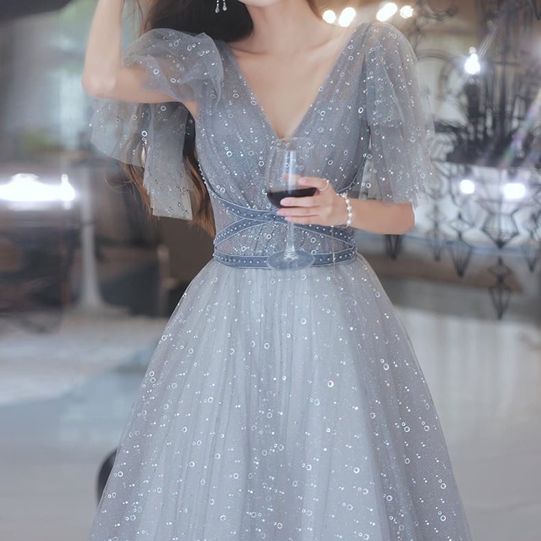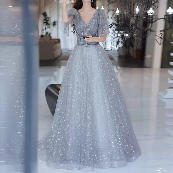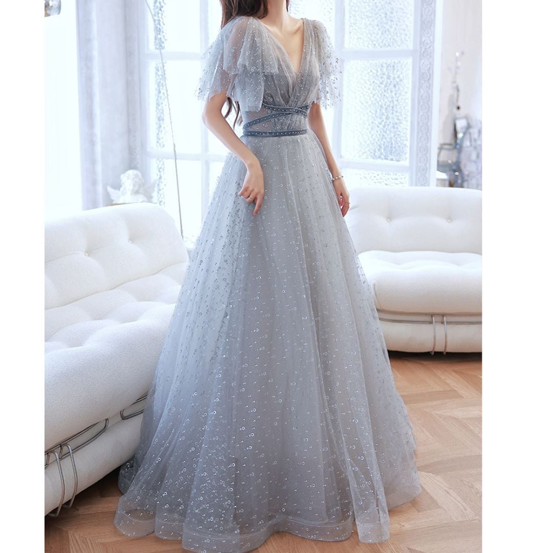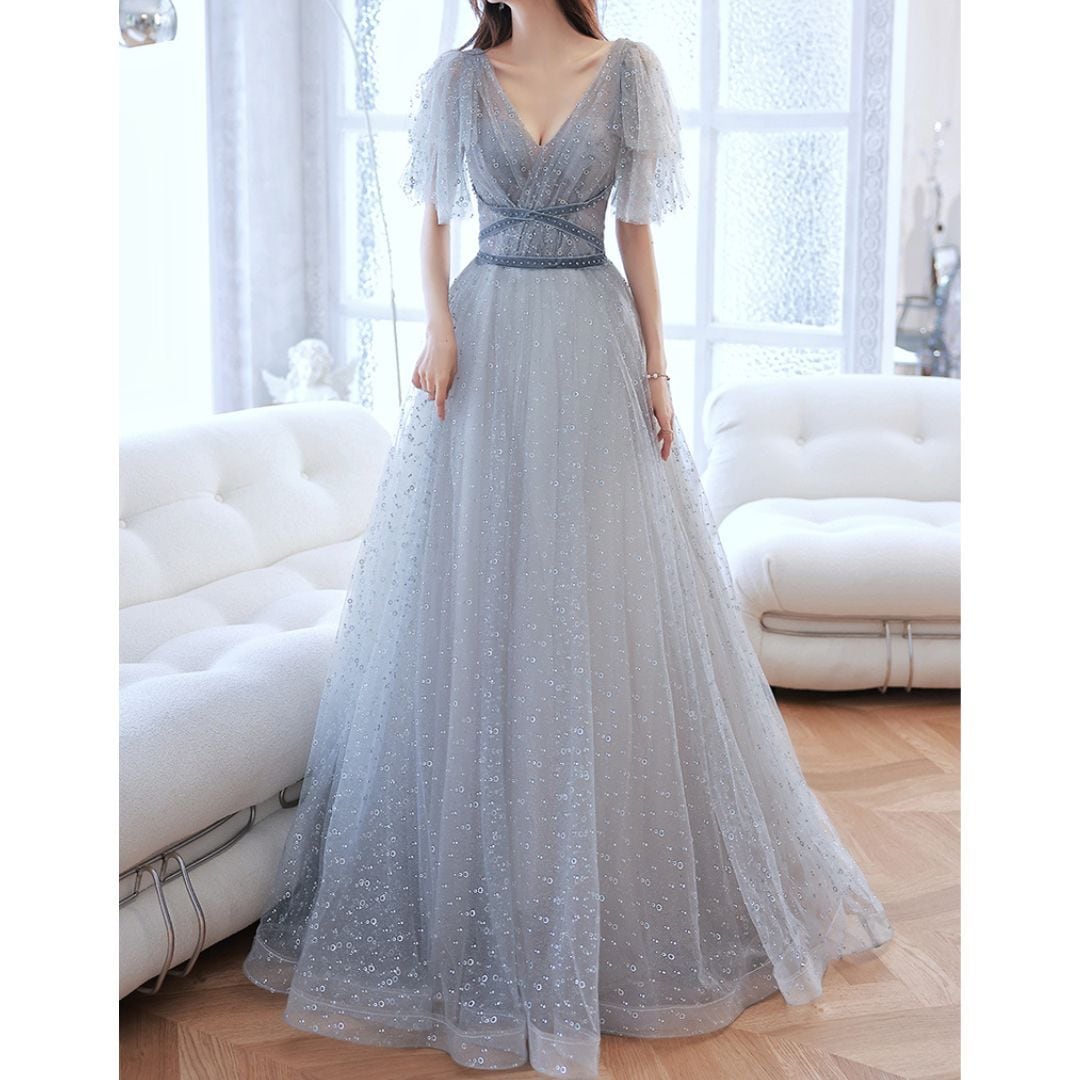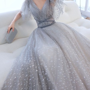 Vネック チュールロングドレス D1129