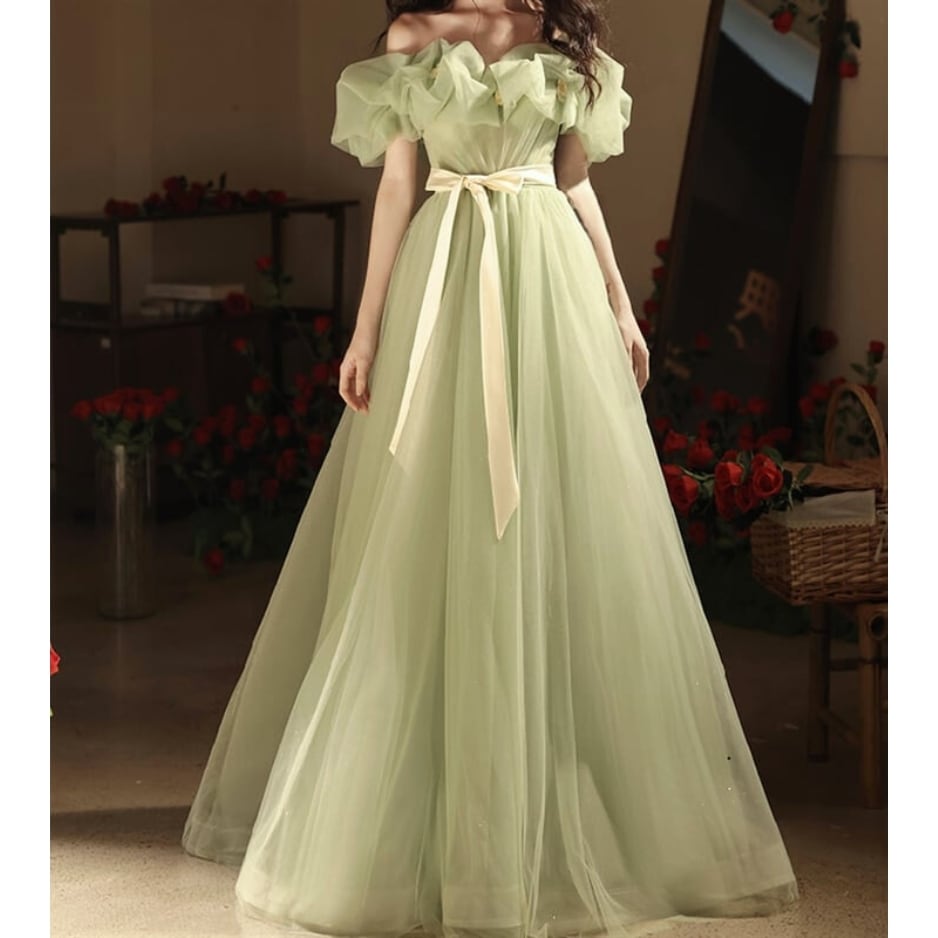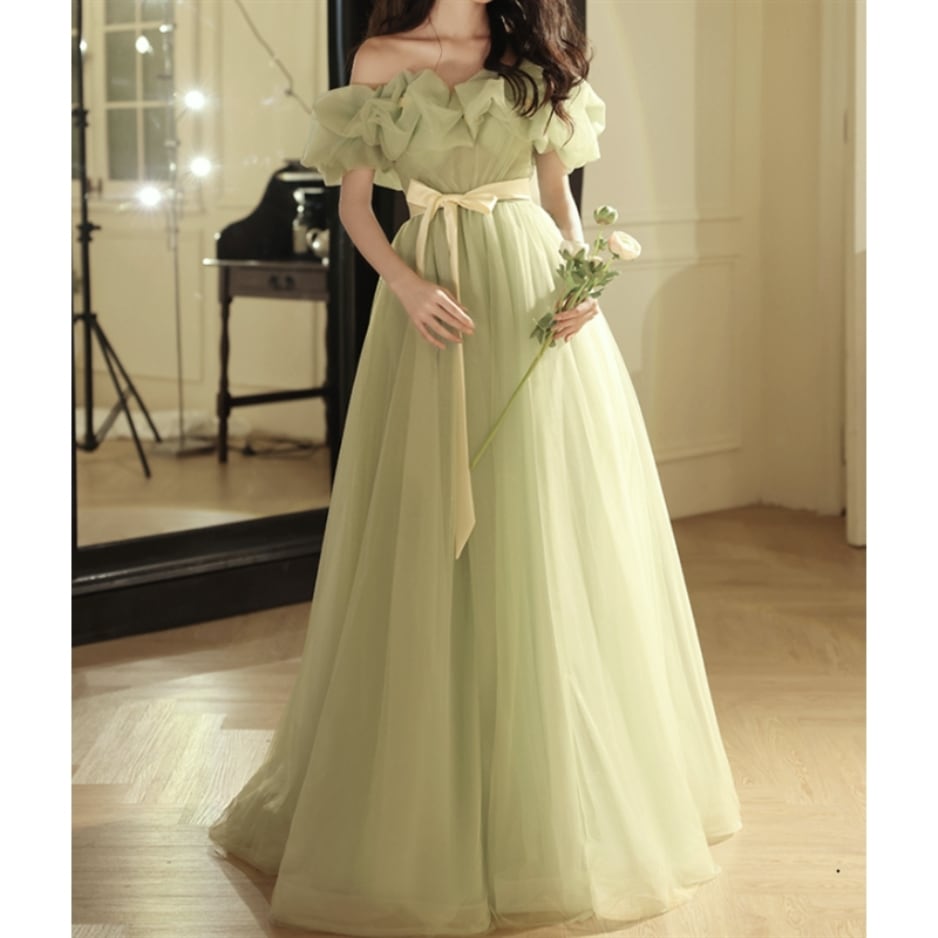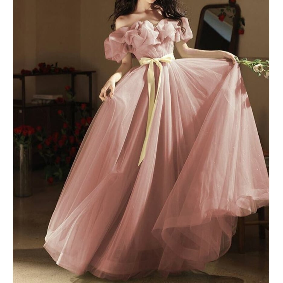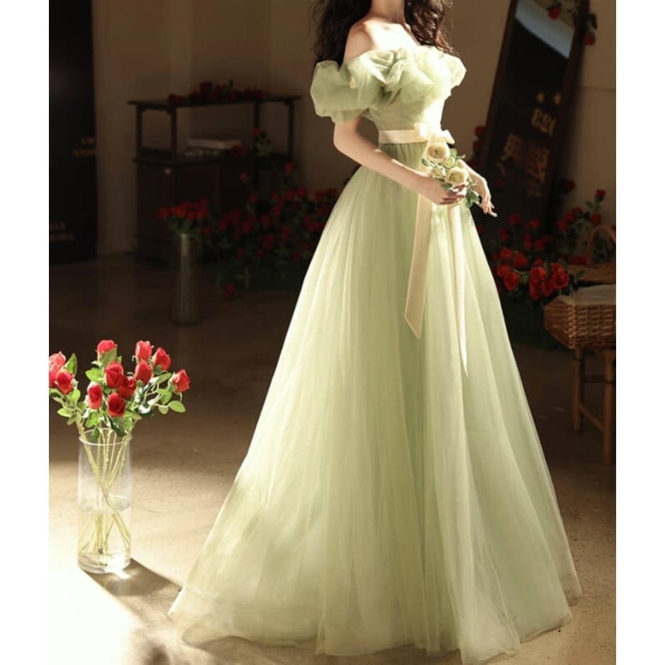 ボリューミーなオフショルダーデザインが華やかで可愛らしい印象のチュールドレスです。