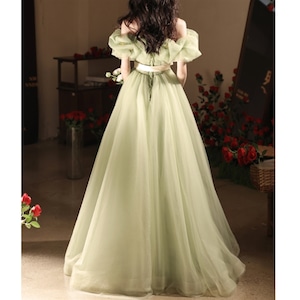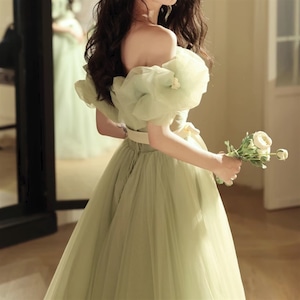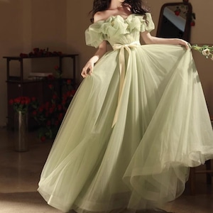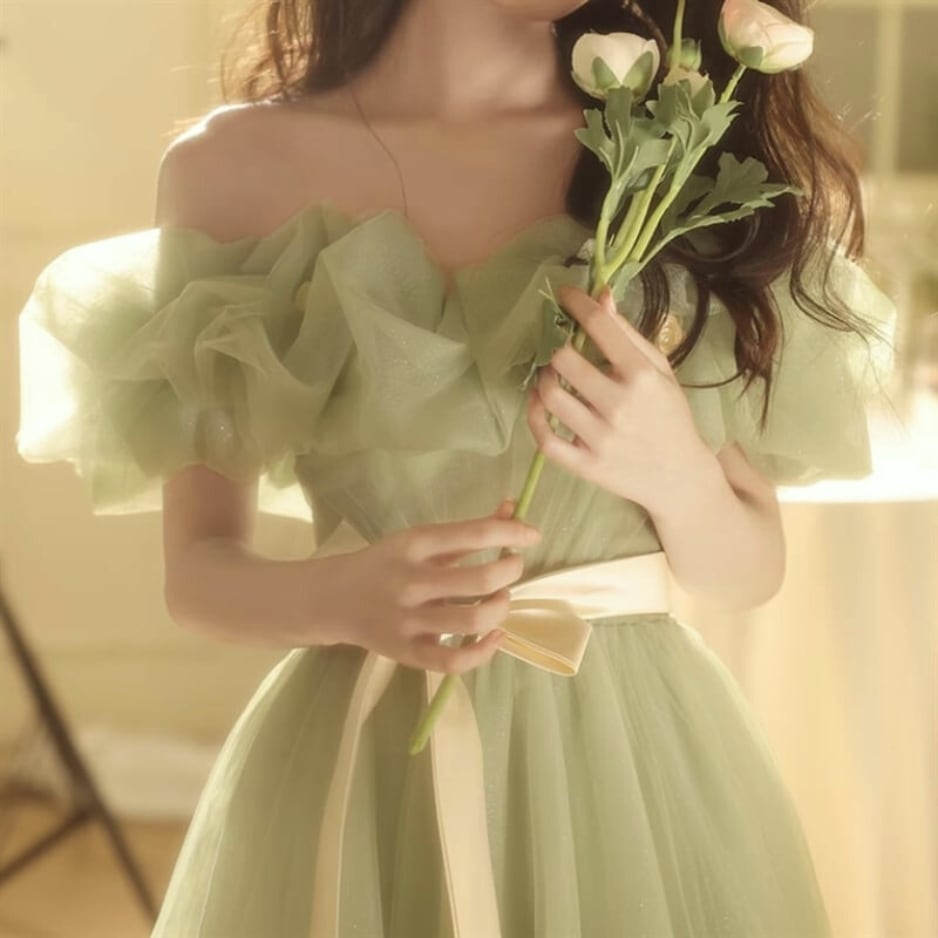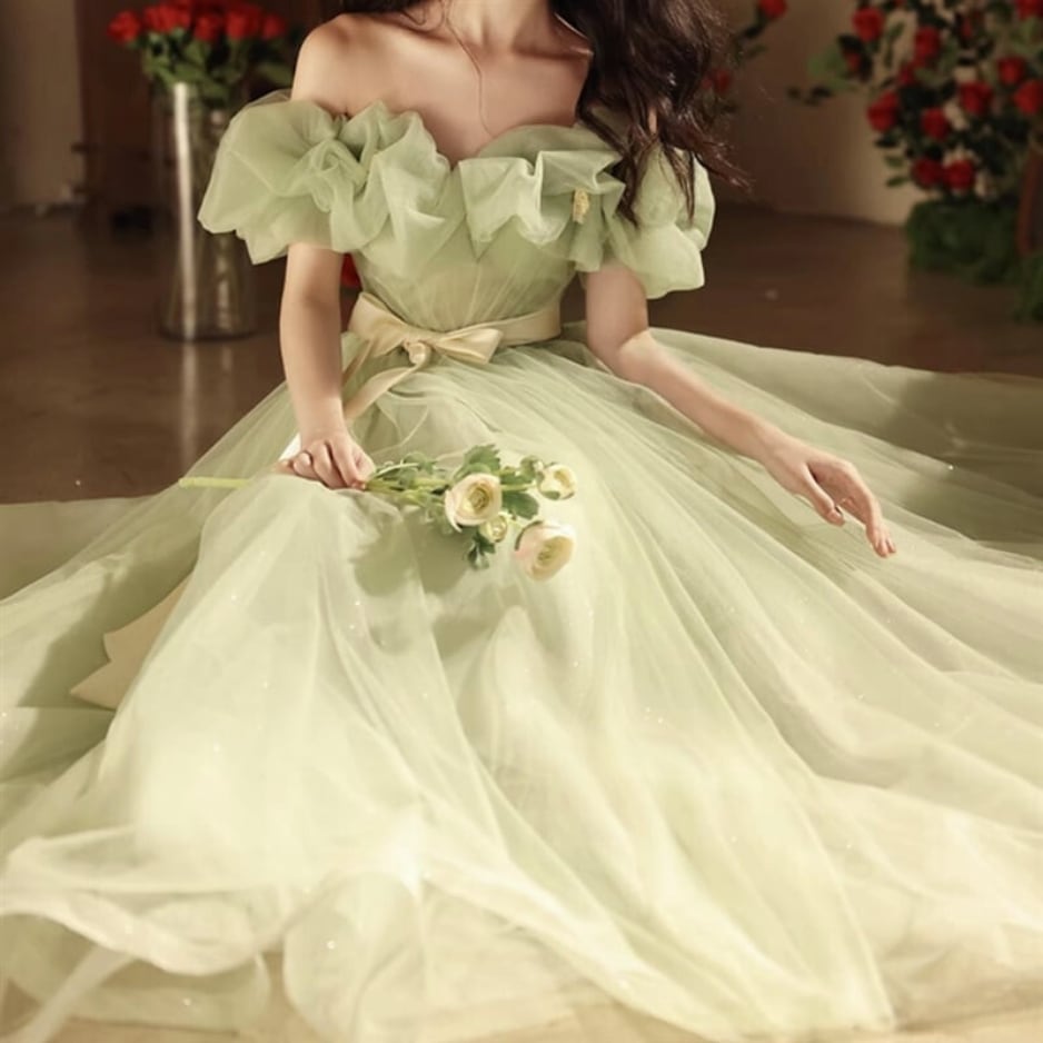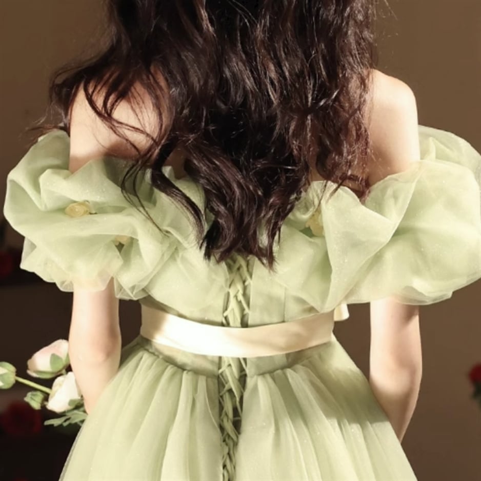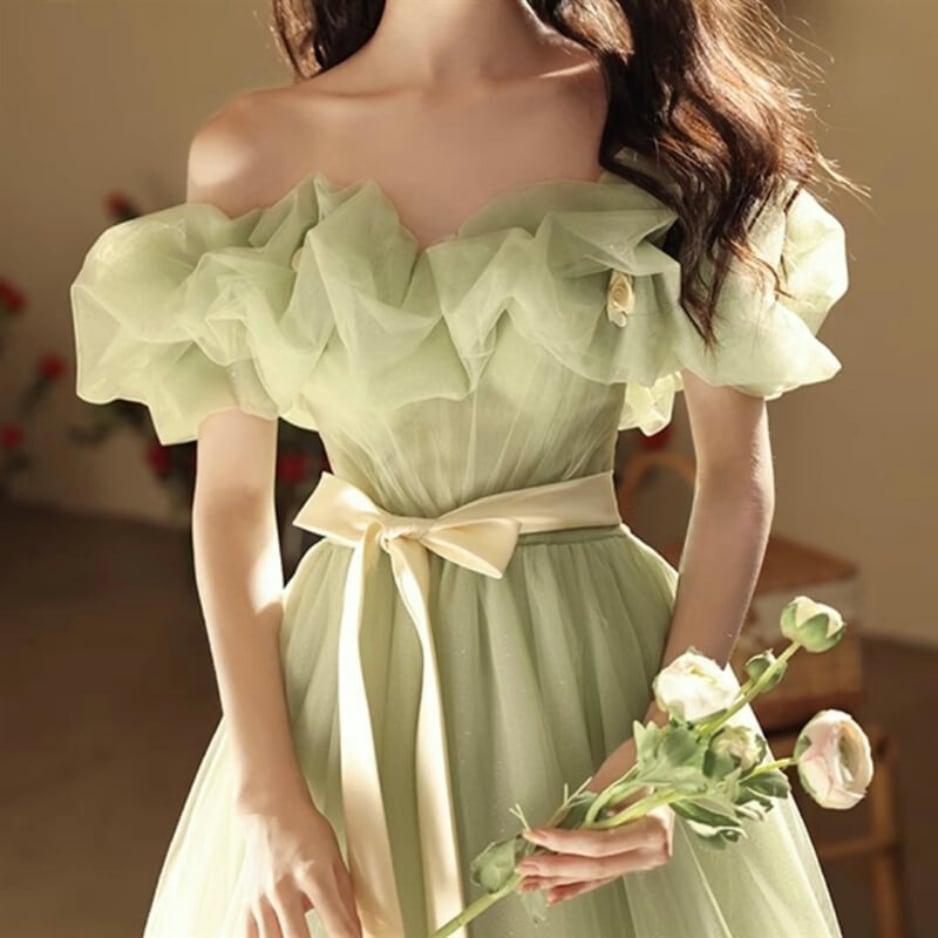 ボリューミーなオフショルダーデザインが華やかで可愛らしい印象のチュールドレスです。