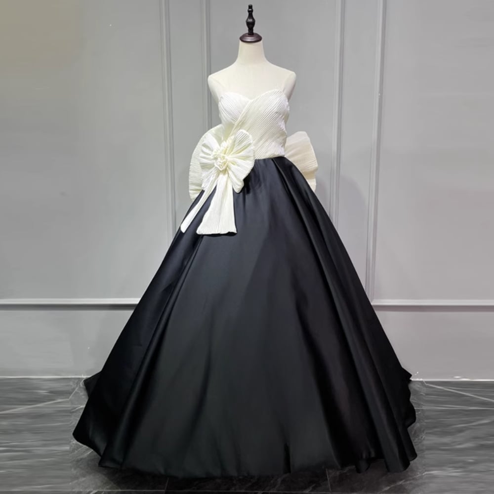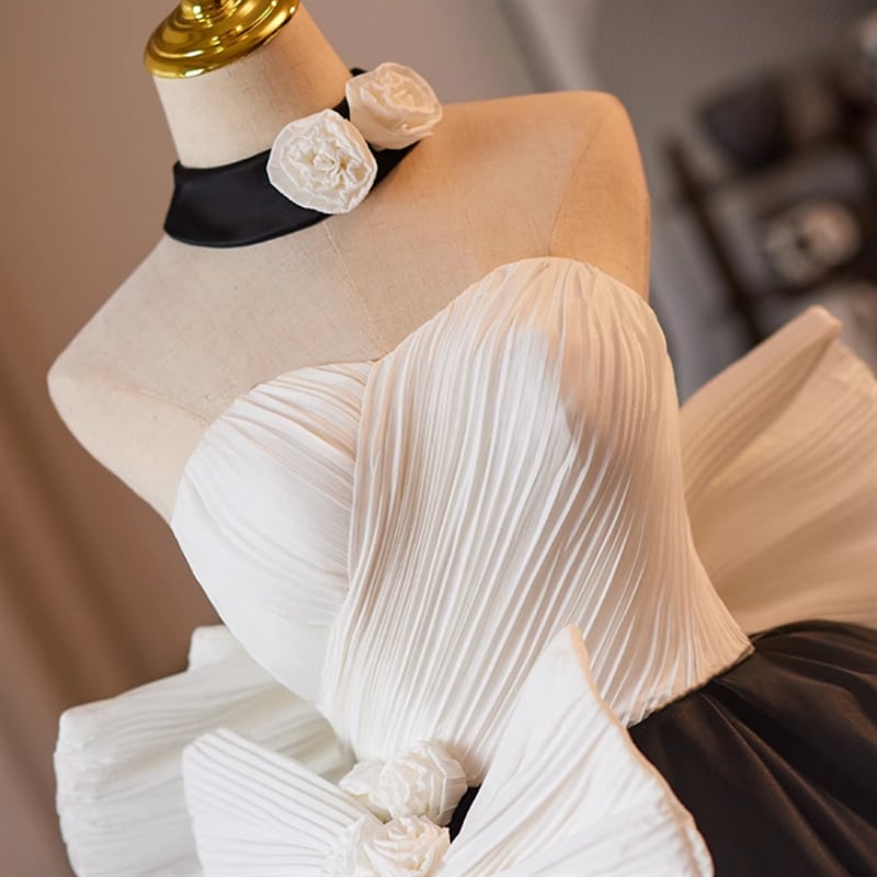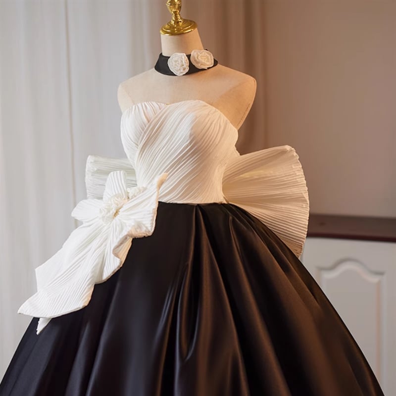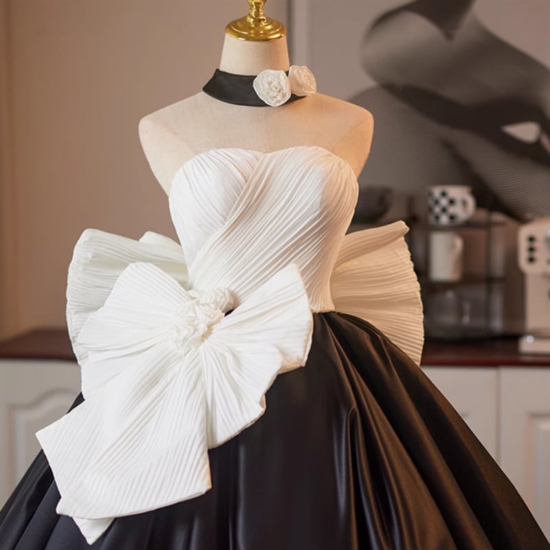 プリーツ加工が施された身頃は美しいラインを描き出し、BIGリボンの装飾で華やかに仕上げた一着です。
