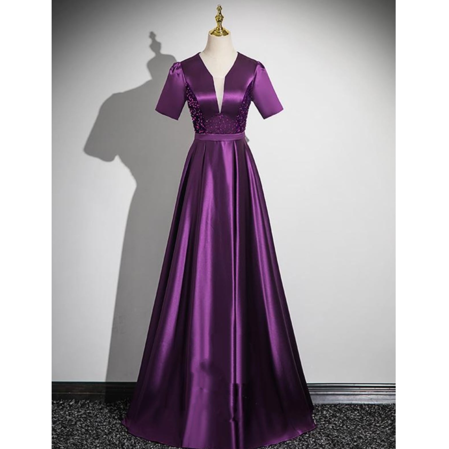 ハーフスリーブで落ち着いた雰囲気に仕上がるAラインドレスです。